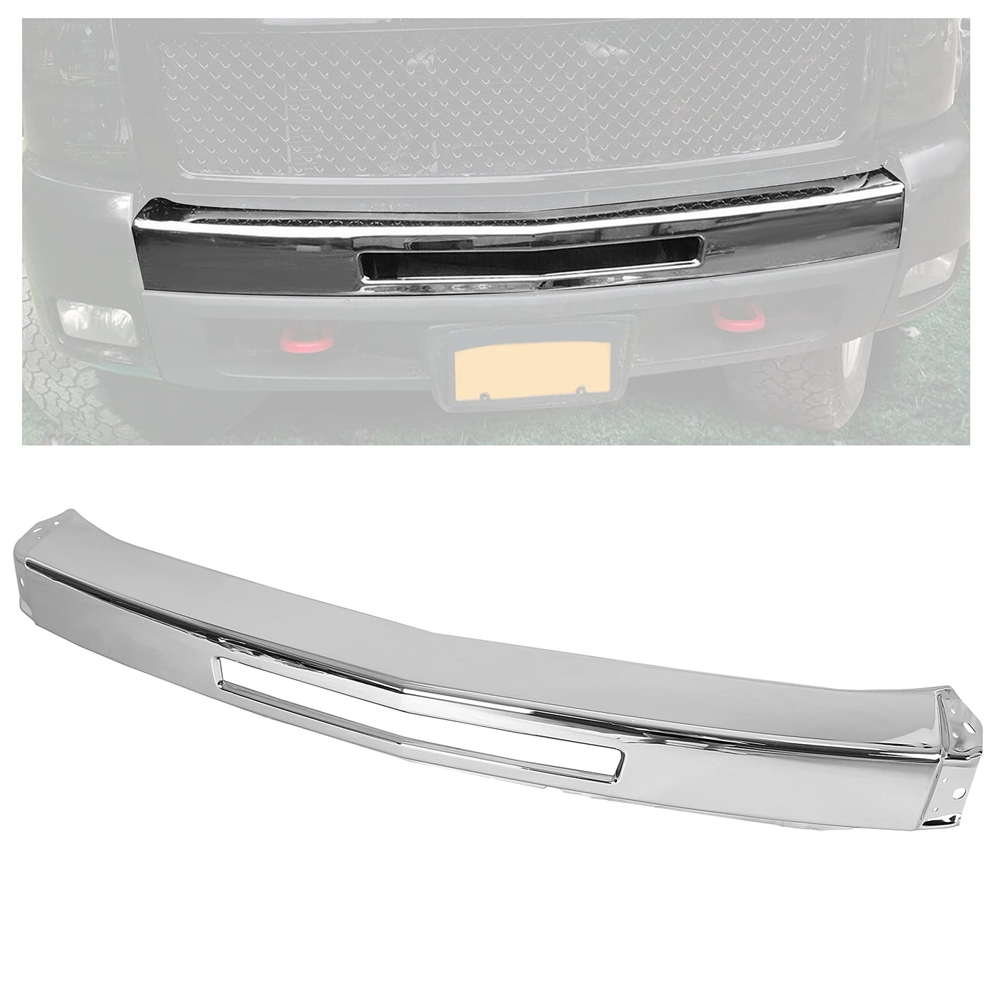 Fitment: Front bumper impact face bar is compatible with 2007-2013 Chevy Silverado 1500 ; Compatible with 2007-2010Chevy Silverado 2500 3500 | Excellent Design: Front bumper impact face bar is designed with the latest software and manufactured with modern tooling | Function: Bumper impat bar comes with center air intake hole.The solid construction and the hard steel makes it not easy to break, tough and durable enough for long-lasting life. Chrome finish promise no scratch on surface | Installation: Professional installation is always highly recommended. This sturdy, reliable replacement product meets your replacement needs | Features: Color/Finish: Chrome; Material:Steel; Replace part number:GM1002831,15941850. Package Listing: 1X Impact Bar