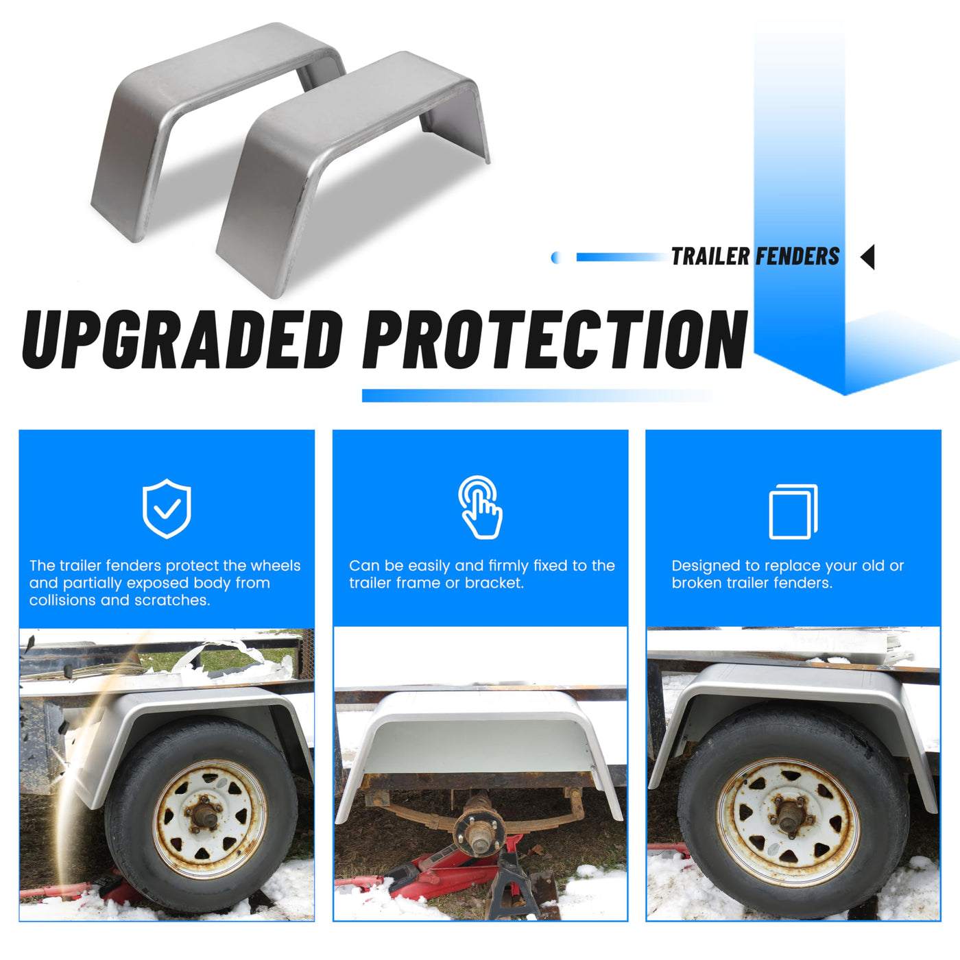 Q: What benefits do these fenders provide for my trailer?A: These fenders offer upgraded protection by shielding the wheels and partially exposed body from collisions and scratches, preventing debris from damaging your trailer.