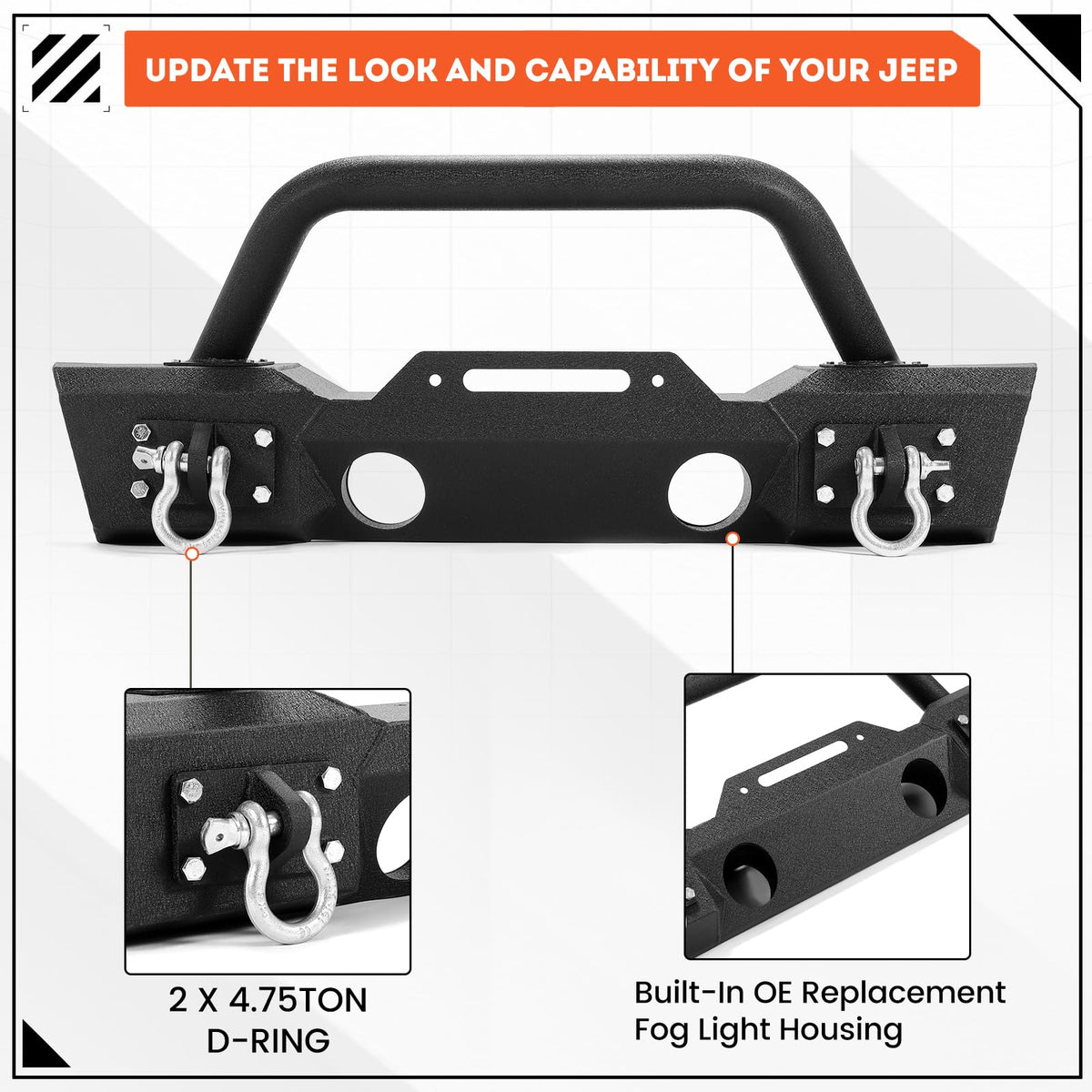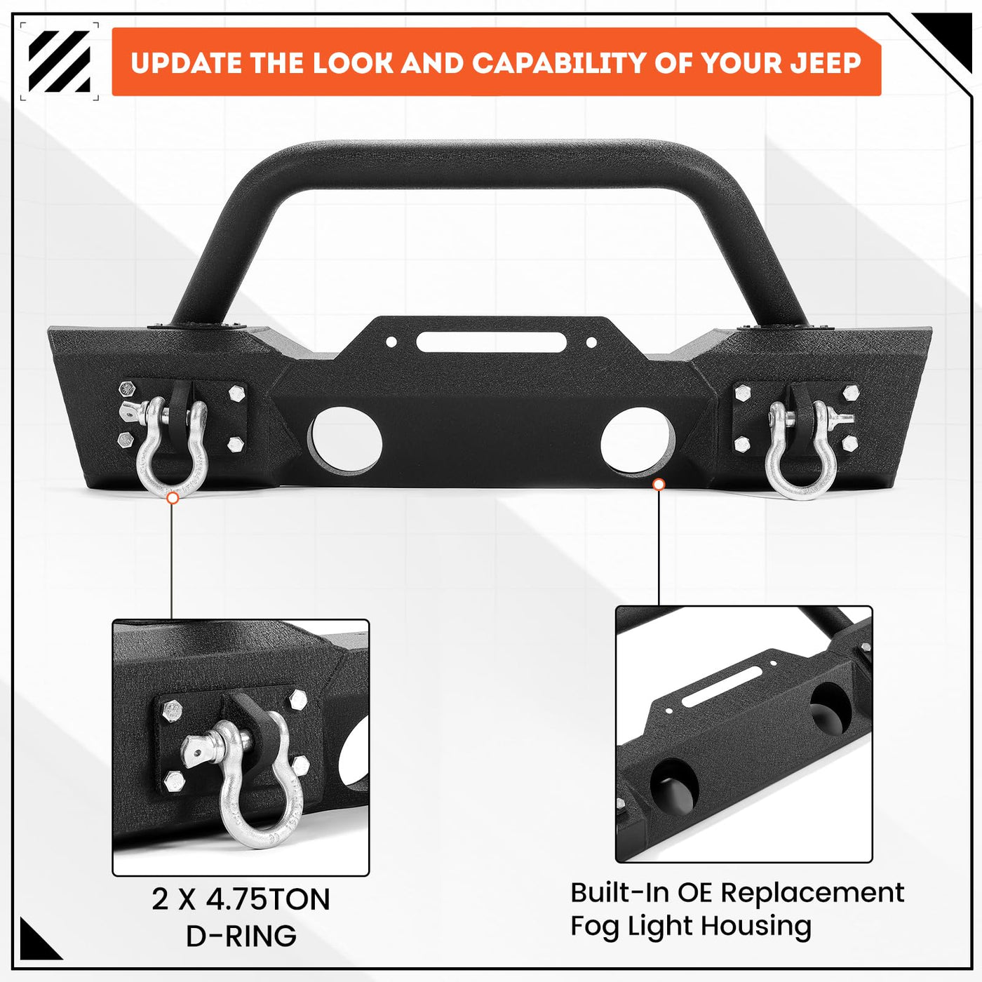 Fitment: The Front Bumper Compatible With 2007-2018 Jeep Wrangler Jk, 2018-2024 Jeep Wrangler Jl, 2020-2024 Gladiator Jt All Models | Heavy Duty Steel: Manufactured From Durable 5/32 '' Steel Sheet And 2 3/8 '' X .120 Wall Steel Tubing. The Front Bumper Features A Textured Black Powder Coated Finish That Provides Protection And Long-Lasting Durability | Integrated Winch Mount: Built-In Winch Plate For Up To 12,000Lb Winch And Built-In Oe Replacement Fog Light Housing. Equipped With A Standard 10 '' X 4.5 '' Bolt Pattern With Integrated Fairlead Panel. Including High Strength 2X D-Ring Mounts | Functional & Stylish: With A Stubby Front Bumper Design And Sleek Approach Angles This Bumper Is An Excellent Complement To Any Level Jeep Build | Package Include: 1 X Front Bumper, 2 X 4.75Ton D-Ring Isolator For Free, Including All Needed Hardware As Shown In Pic. Easy Bolt-On Installation, No Drilling Or Cutting Required. No Instructions, Please Refer To The Installation Video