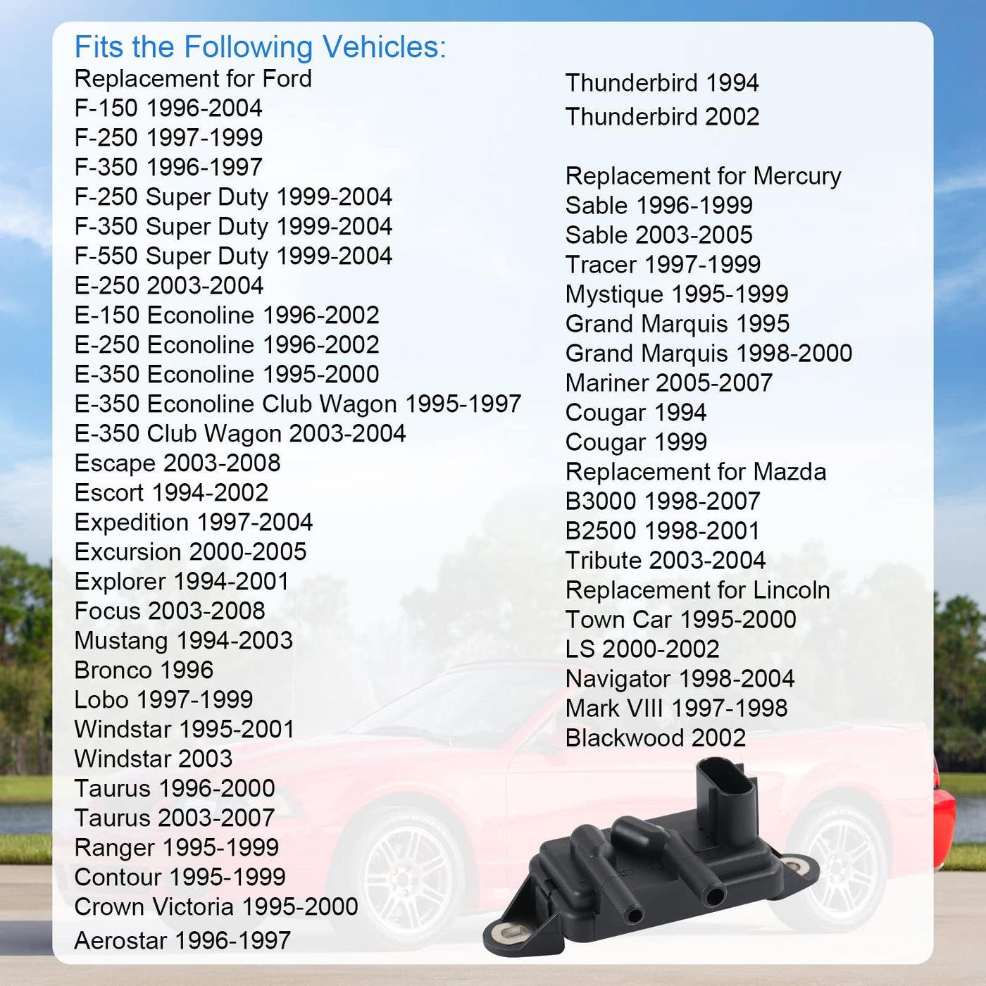 Q: What vehicles are compatible with the EGR Exhaust Gas Recirculation Pressure Feedback Sensor?A: The EGR Exhaust Gas Recirculation Pressure Feedback Sensor is compatible with several Ford models including F-150, F-250, F-350, Ranger, and various Mercury, Mazda, and Lincoln vehicles. Notable compatibility includes Ford F-150 (1996-2004), F-250 (1997-1999), F-350 (1996-1997), and models like Mercury Sable (1996-2005) and Mazda B3000 (1998-2007).