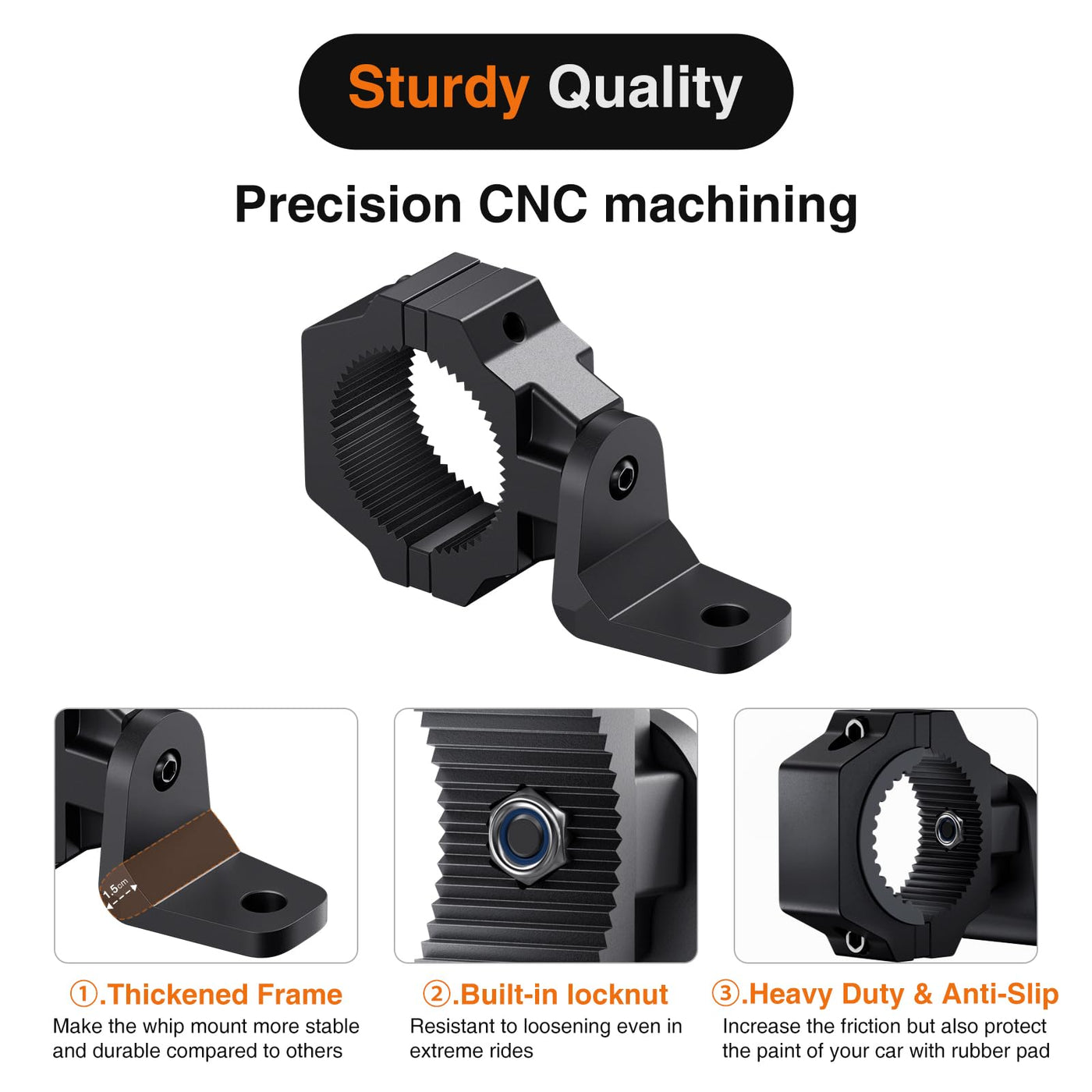 Q: What materials are used in the construction of the Ehaho UTV Whip Mount?A: The Ehaho UTV Whip Mount is constructed from premium solid aluminum alloy, providing durability and resistance to heat, corrosion, rust, and dirt, making it ideal for off-road conditions.