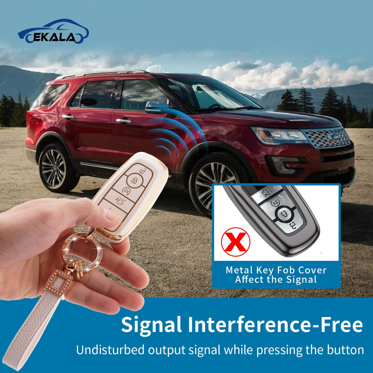 EKALA for Ford Key Fob Cover with Leather Key Fob Keychain, 5 Buttons Soft TPU Keys Shells Girly White Key Fob Cover Compatible