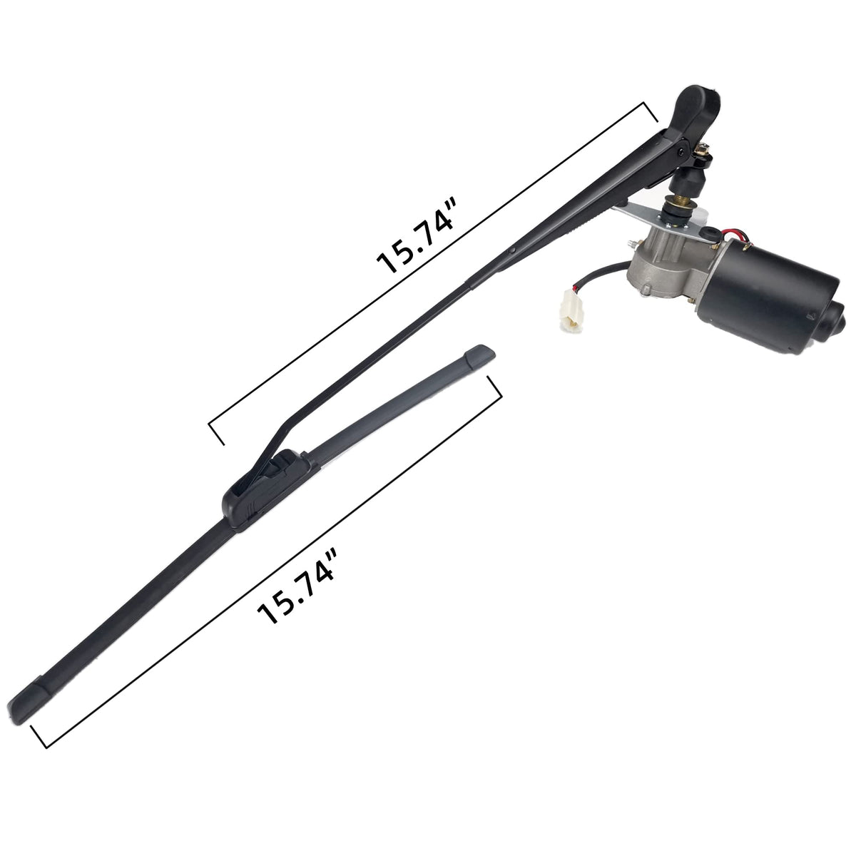 Q: What specifications should I know before purchasing this wiper kit?A: Before purchasing the wiper kit, it's essential to know that it operates on a 12V DC power supply and has a motor voltage of 12V and 30W. The wiper arm and blade are both 15.74 inches in size, and the kit includes a washer pump bottle with a capacity of 1.5 liters.
