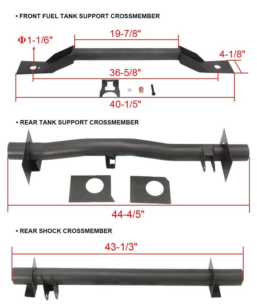 Q: What components are included in the ELITEWILL crossmember kit?A: The kit includes a Front Fuel Tank Support, a Rear Tank Support Crossmember, a Rear Shock Crossmember, as well as the necessary bracket and screws.