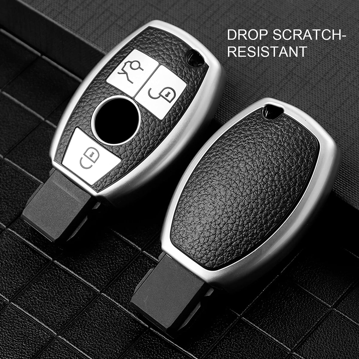 Introducing the ultimate solution for safeguarding your Mercedes Benz key fob: the ELOHEI Key Fob Cover. Designed specifically for various Mercedes models including the C, E, M, S, CLS, CLK, GLK, GLC, and G Class, this key fob cover combines functionality with elegance. Its Leather Texture Silver finish adds a touch of sophistication while ensuring your key remains protected.