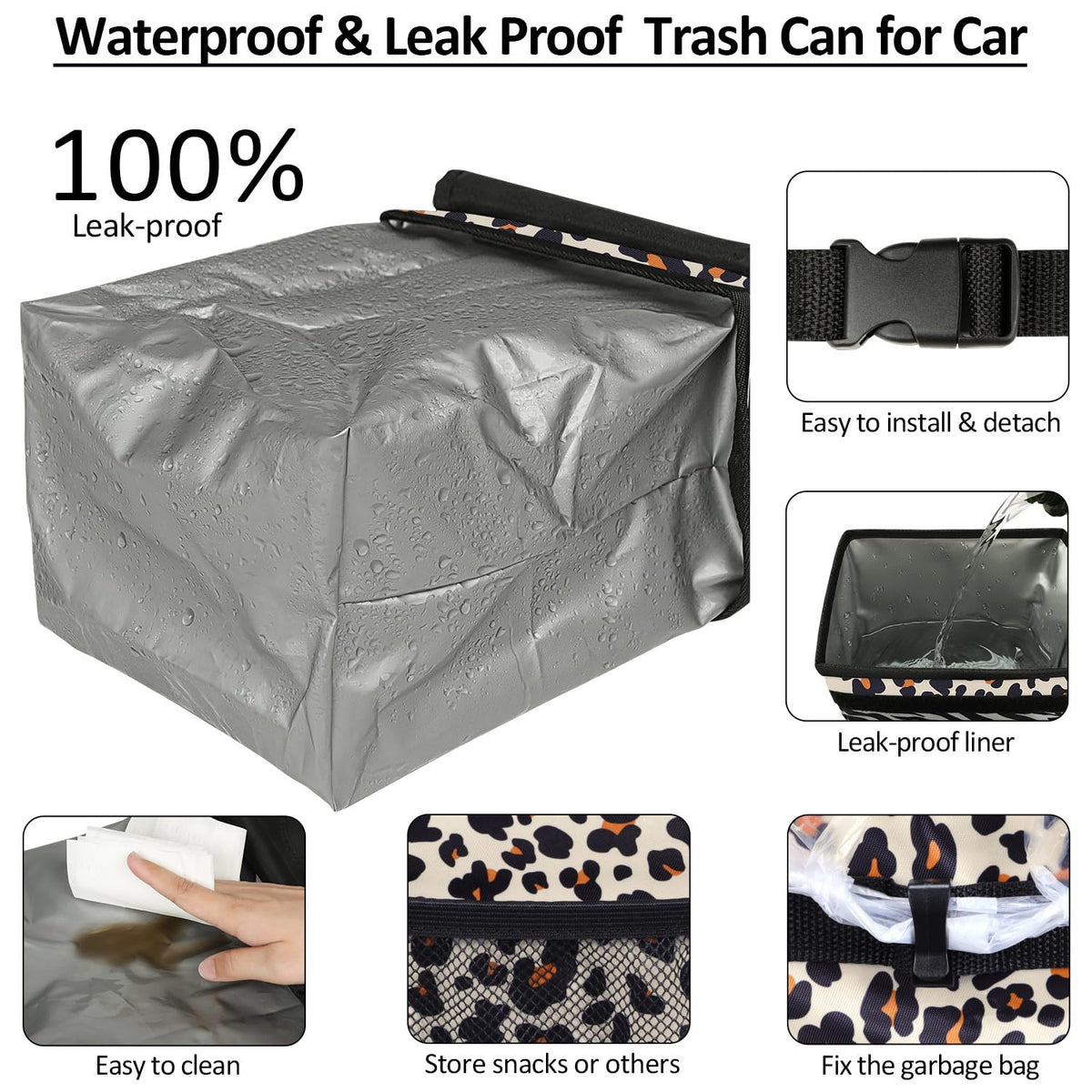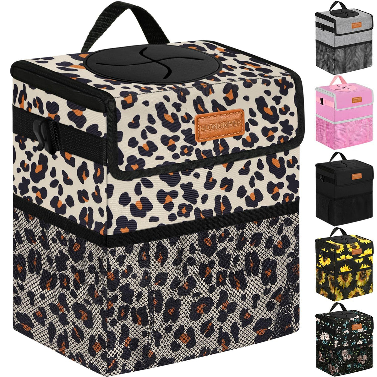 Elongriver Car Trash Can Bin For Back Seat, Leak Proof, Cute Car Trash Bag Hanging, Vehicle Trash Can For Suv Truck Van, Leopard