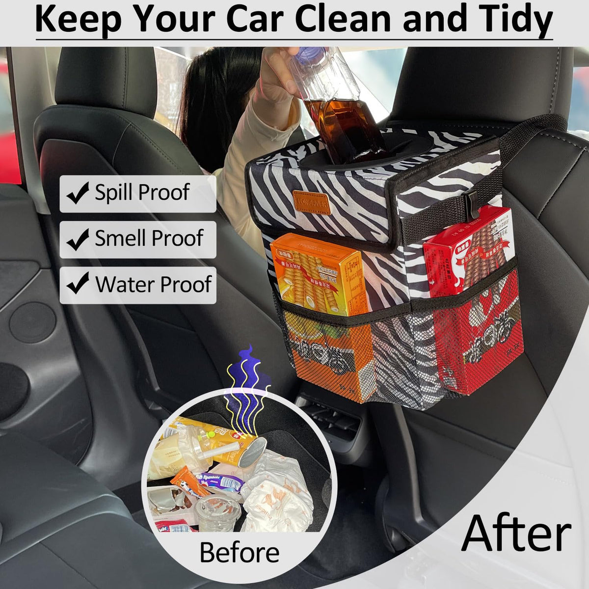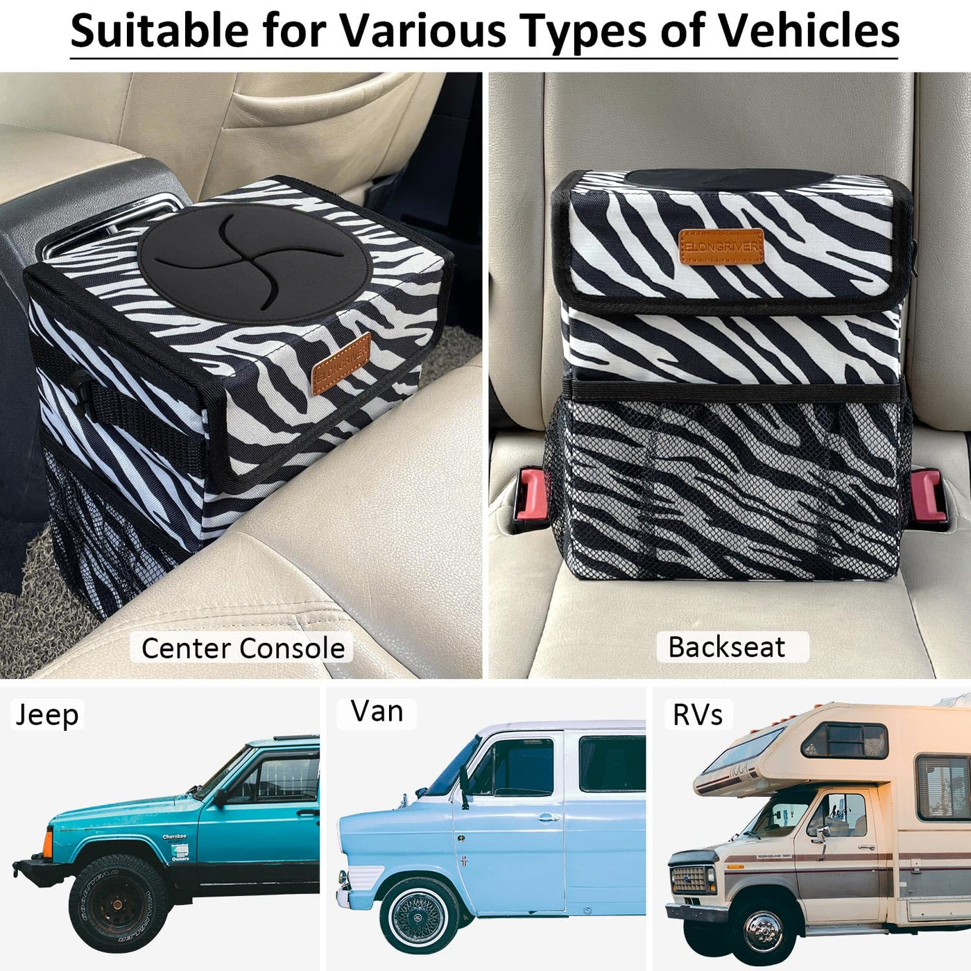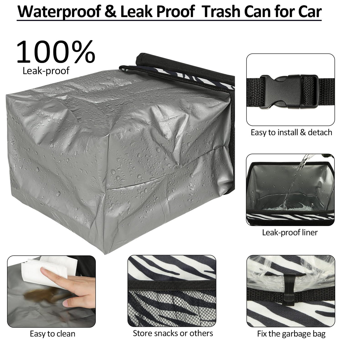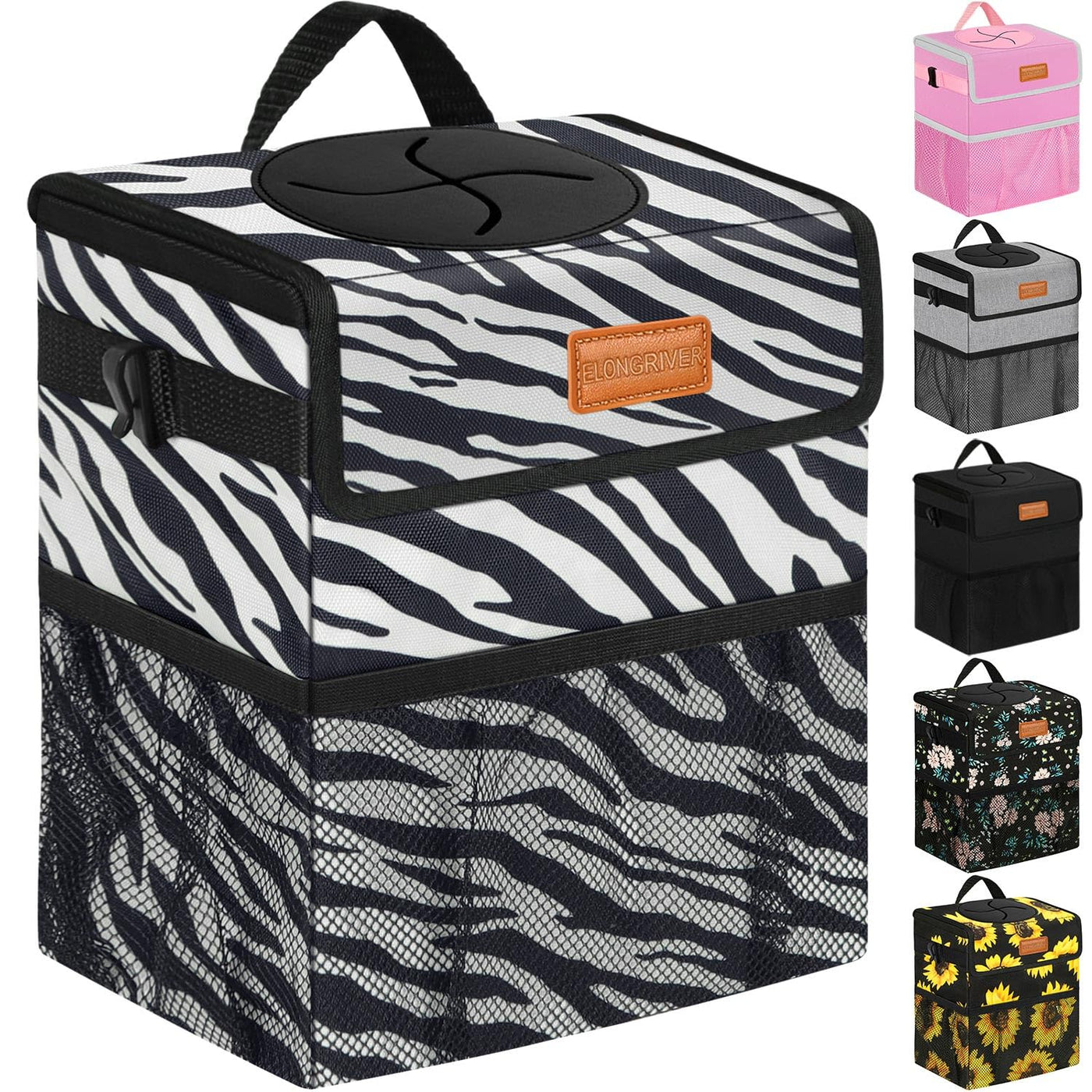 Elongriver Car Trash Can For Car With Lid, Car Organizer Can Trash Bag Hanging Leak Proof Vehicle Trash Can Zebra