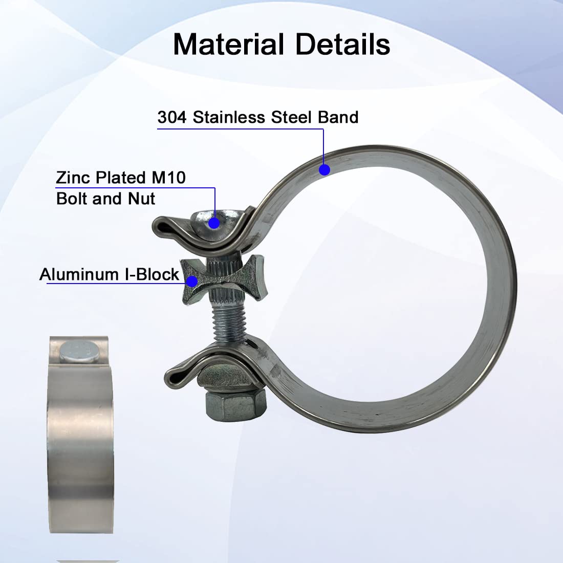 Q: What materials are used in the Emotor exhaust clamp?A: The Emotor exhaust clamp is made from high-quality T304 stainless steel for the band, complemented by a zinc-plated M10 bolt and nut, a steel gasket, and an aluminum alloy I-block for durability and resistance to corrosion.