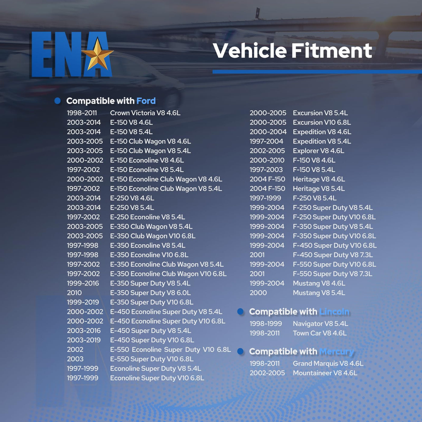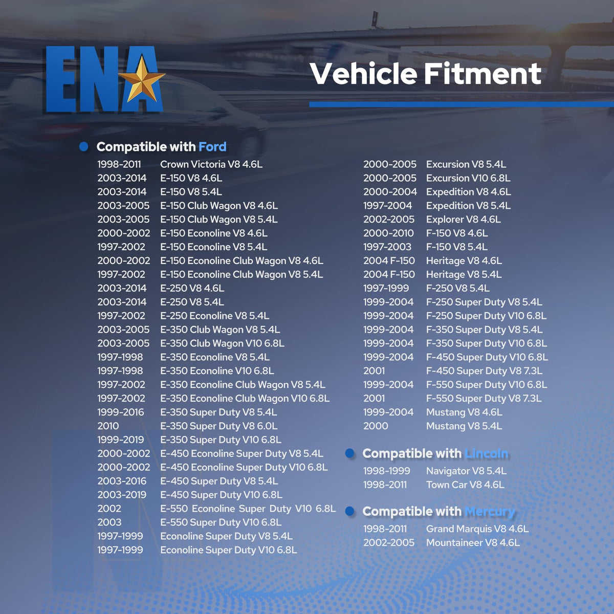 Compatible with 1998-2011 Ford Crown VictoriaCompatible with 1999-2002 Ford E-150 EconolineCompatible with 2000-2002 Ford E-150 Econoline Club WagonCompatible with 2000-2004 Ford ExpeditionCompatible with 2002-2005 Ford ExplorerCompatible with 2000-2003 Ford F-150Compatible with 2003-2014 Ford E-150Compatible with 2003-2005 Ford E-150 Club WagonCompatible with 2003-2014 Ford E-250Compatible with 1997-2002 Ford E-350 Econoline 6.8LCompatible with 1997-2002 Ford E-350 Econoline Club WagonCompatible with 1997-1999 Ford Econoline Super DutyCompatible with 2000-2002 Ford E-450 Econoline Super DutyCompatible with 2000-2002 Ford E-450 Econoline Super Duty StrippedCompatible with 2000-2005 Ford ExcursionCompatible with 2003 Ford E-450 Super Duty Stripped Chassis, E-550 Super Duty and E-350Compatible with 2003-2005 Ford E-350 Club WagonCompatible with 2003-2017 Ford E-450 Super DutyCompatible with 2004-2018 Ford E-350 Super Duty These do not fit the 2004 and newer F150 with the 5.4L V8 Compatible with 1997-2002 Ford E-150 EconolineCompatible with 1997-2002 Ford E-150 Econoline Club WagonCompatible with 1997-2002 Ford E-250 EconolineCompatible with 1997-2002 Ford E-350 EconolineCompatible with 1997-2002 Ford E-350 Econoline Club WagonCompatible with 2003 Ford E-350Compatible with 2003-2005 Ford E-350 Club WagonCompatible with 2004-2005 Ford E-250 Super DutyCompatible with 2004-2016 Ford E-350 Super DutyCompatible with 1997-1999 Ford Econoline Super DutyCompatible with 1997-2003 Ford F150Compatible with 1997-2004 Ford ExpeditionCompatible with 2000-2002 Ford E-450 Econoline Super DutyCompatible with 2000-2002 Ford E-450 Econoline Super Duty StrippedCompatible with 2000-2005 Ford ExcursionCompatible with 2003 Ford E-450 Super Duty Stripped ChassisCompatible wit