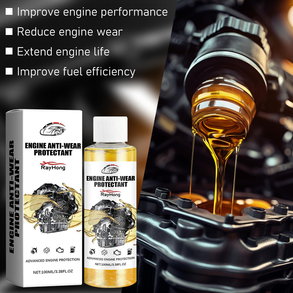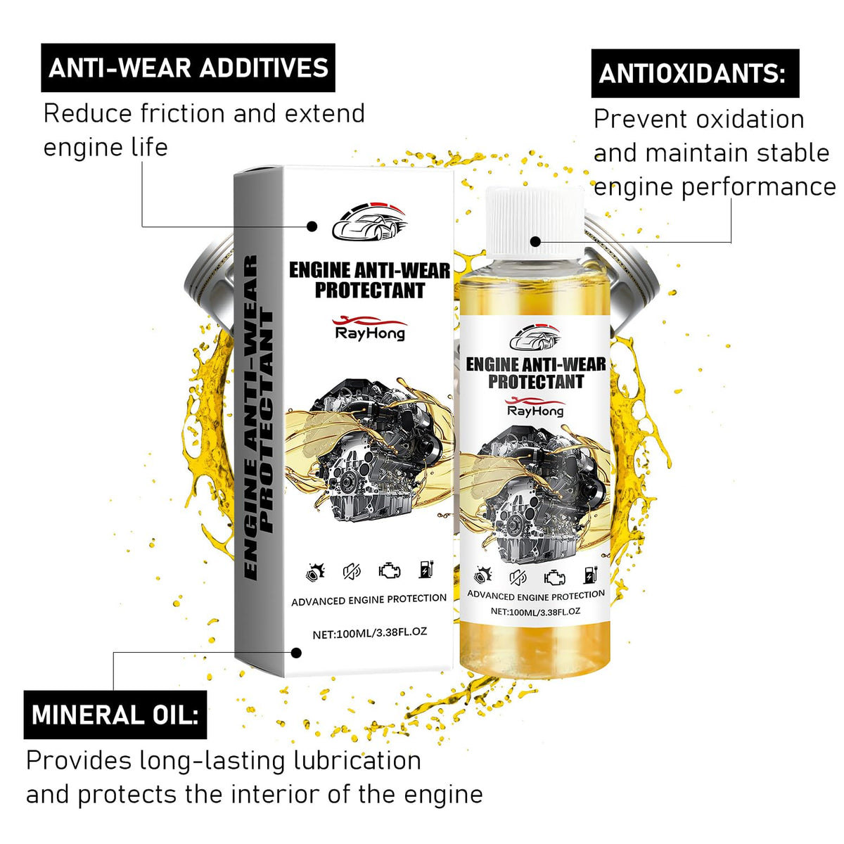 How to use It is recommended to add this product when changing the oil will have better effect, it is recommended to add once in 5000 kilometers. Step 1: Turn off the engine and add the product after idling the car for 10 minutes. Step 2: After adding the product, make the engine run for 10 minutes or drive normally. Specification: Name: Engine -Wear Protectant Net Content: 100 ml Shelf Life: 3 Years Compatibility: Engine, Transmission Package Includes: 2 pcs * Engine -Wear Protectant Notes: 1.Follow The Recommended Usage Instructions Provided On The Product Label For Optimal Results. 2.Consult Your Vehicle'S Owner'S Manual For And Specific Usage Guidelines.