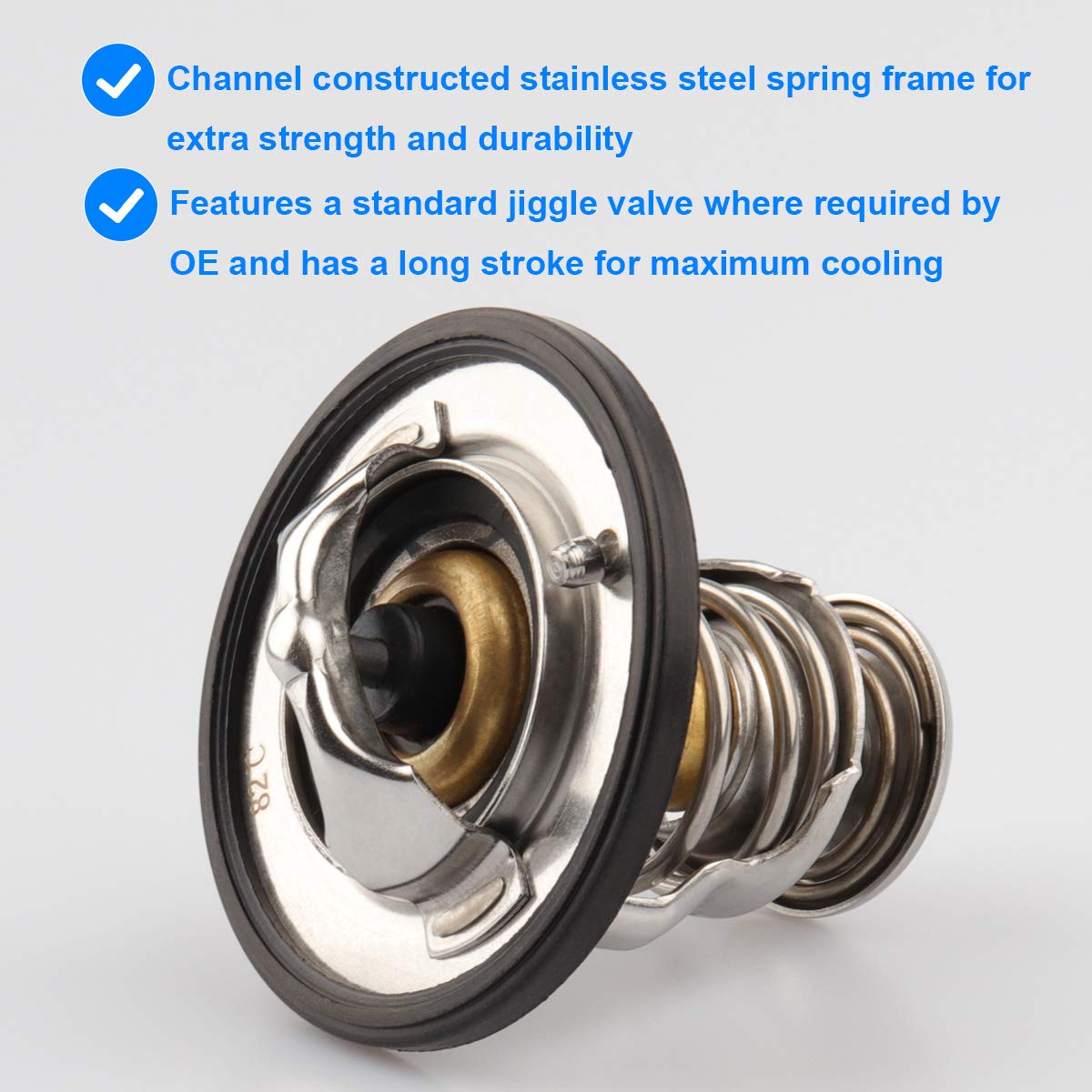 Q: What distinguishes this thermostat from other aftermarket options?A: This thermostat is designed to meet or exceed original equipment performance standards, featuring high-quality OE style construction for durability. It includes a stainless steel mounting flange for proper fitment and a robust spring frame for added strength, ensuring reliable engine temperature regulation.
