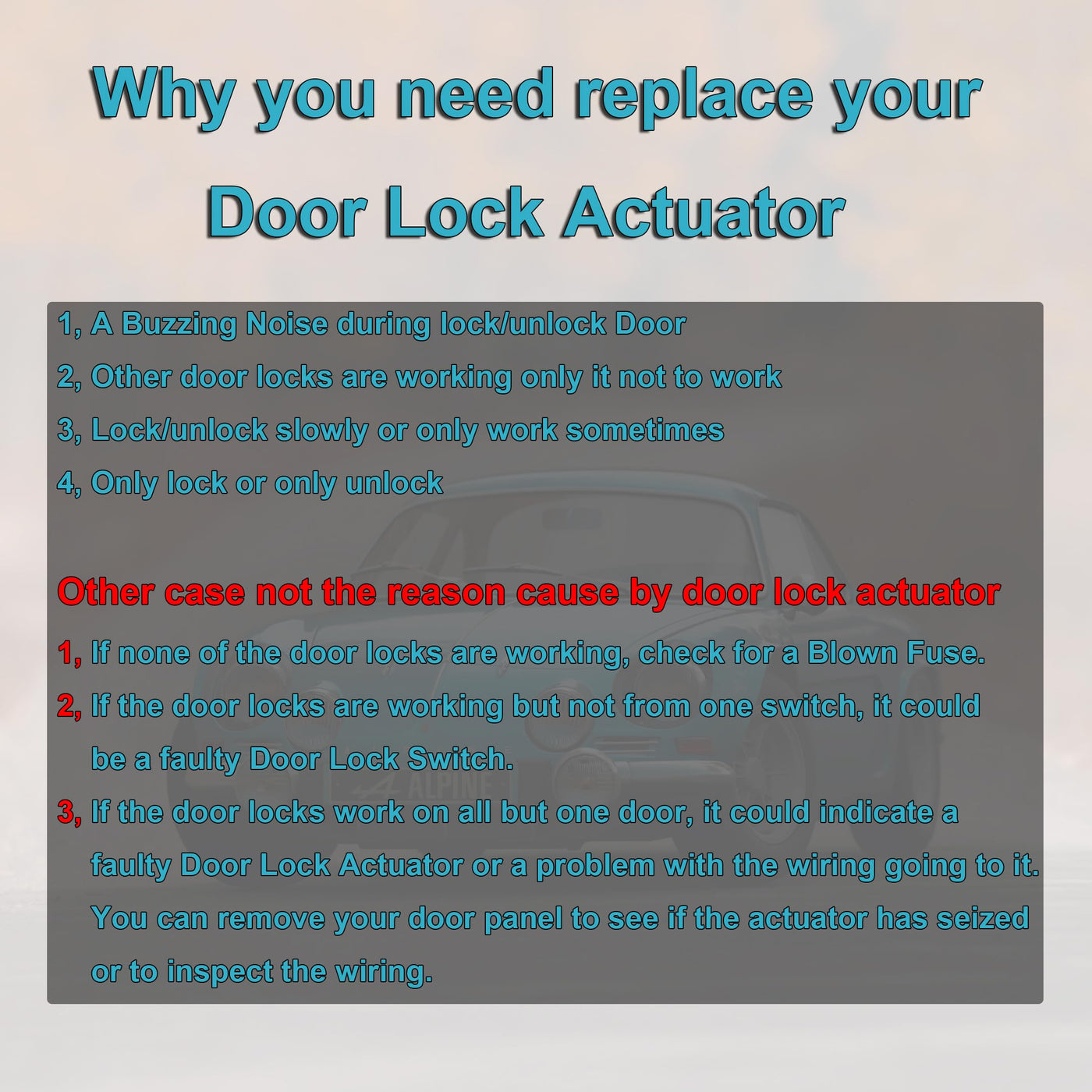 Q: What is the function of the Door Lock Latch Actuator?A: The Door Lock Latch Actuator motor restores the ease and convenience of remotely locking or unlocking your vehicle doors, ensuring that your power door lock operates properly.