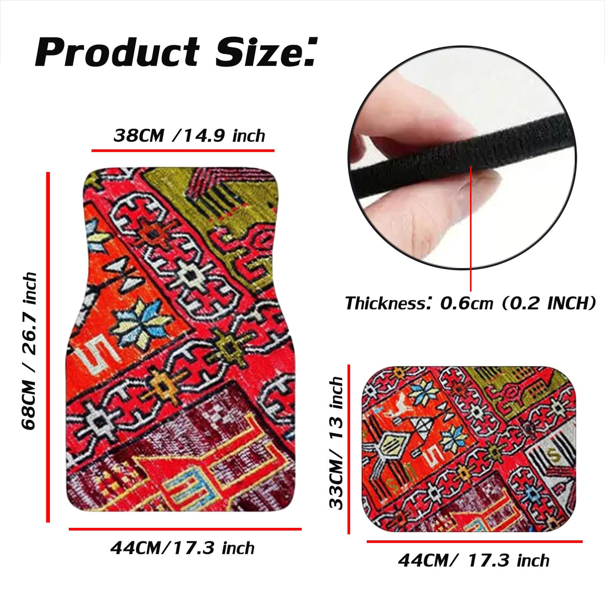 Specification: Size: Front mats 17.3 x 26.8 (44 x 68 cm); Rear mats 13 x 17.3 (33 x 44 cm) Material: Polyester on top and non-slip rubber backing, heavy-duty, washable and practical Package Included: 4 PCS Car Floor Mat Set ( 2 Front Mats and 2 Rear Mats) Reminder: --- Due to different measurement methods, an error of 1-3cm in this size data is considered normal. --- The picture display effect is for reference only, the final effect shall prevail in kind! Due to objective factors such as production batches, machinery and equipment, it is difficult to avoid or there will be errors such as slight color difference, position and size. If the above problems are normal. --- Maintenance: Easy to install and maintain; Easy to clean, just vacuum or rinse off dirt, mud and spills with water; Air drying is recommended. The mats are rolled in a package for easy transportation, please spread them out flat and check if the items are complete when you receive the package.