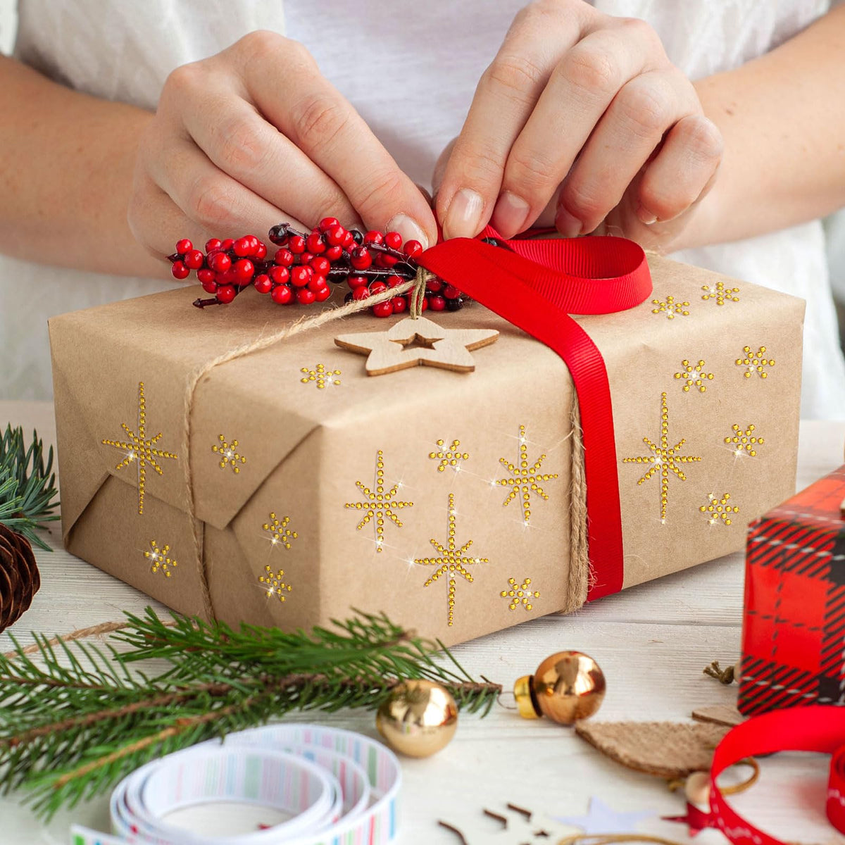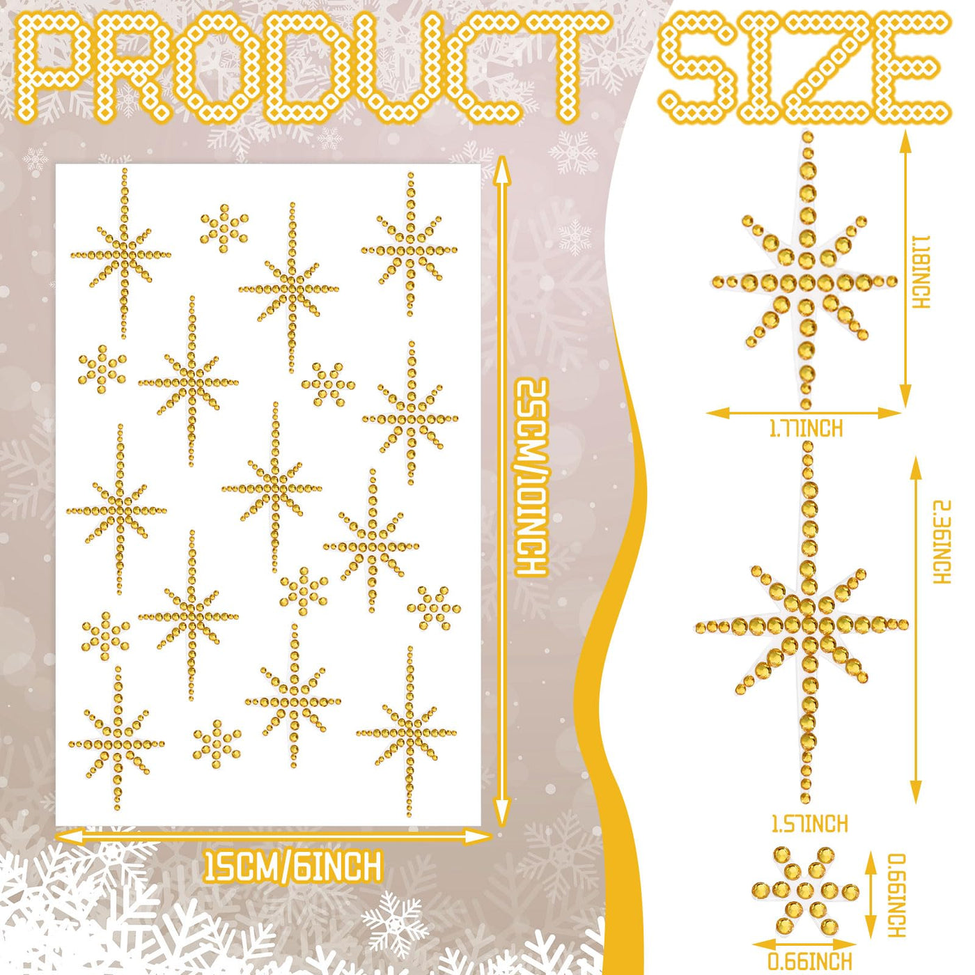 Features: The smooth, acrylic rhinestone material of our Christmas crystal star stickers, creating an enchanting and eye catching aesthetic that your guests won't miss. Surprise your loved ones with a unique and thoughtful gift. These Christmas rhinestone stickers are ideal for DIY enthusiasts or anyone looking to add a personal touch to their holiday decorating. Specifications: Material: acrylic rhinestone Color: gold Size: about 5.91 x 9.84 inches/ 15 x 25 cm Package includes: 4 Sheets of Star of Bethlehem stickers Notes: Manual measurement, please allow slight errors on size. The color may exist a slight difference due to different screen displays.