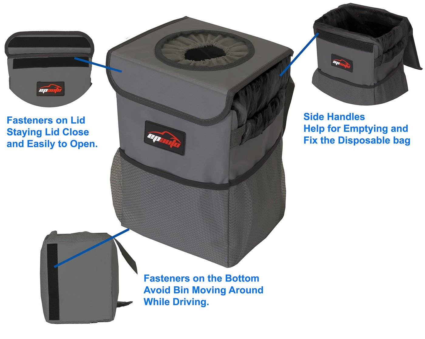 Epauto Waterproof Car Trash Can With Lid And Storage Pockets, 2.5 Gallon Leakproof, Dark Gray