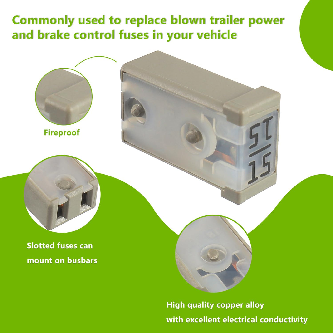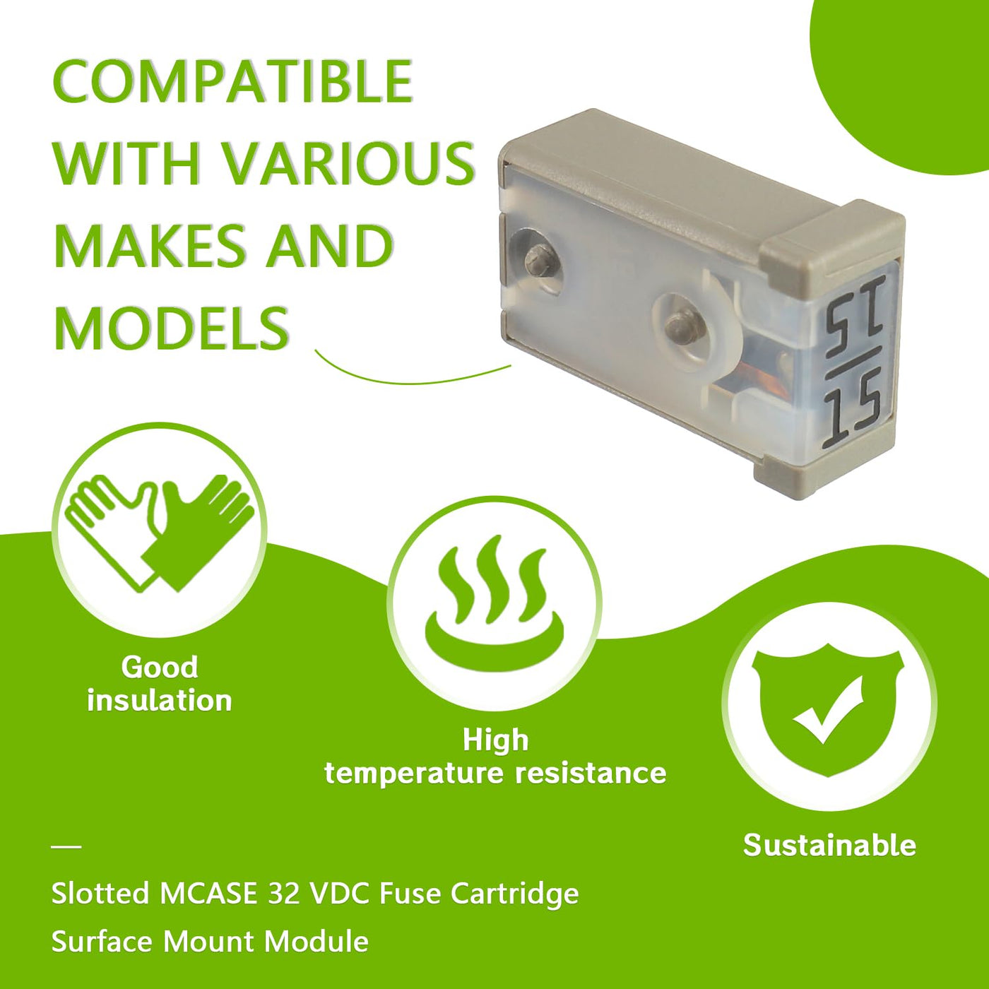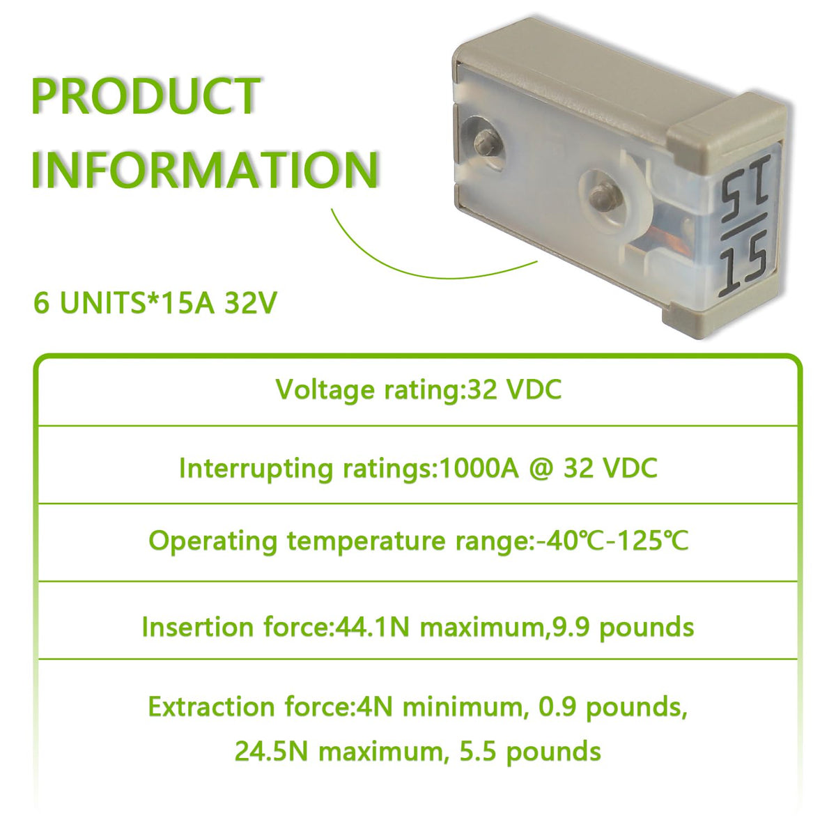 EPLZON 15A MCASE 32 VDC Fuse Cartridge Surface Mount Module ??Widely used in car truck SUV home boat RV ATV UTV golf cart and more electronic equipment. ??TIPS:Compatible with various makes and models Specifications: ??Voltage rating:32 VDC ??Interrupting ratings:1000A at 32 VDC ??Operating temperature range:-40?-125?/-40?-257? ??Insertion force:44.1N maximum,9.9 pounds ??Extraction force:4N minimum, 0.9 pounds,24.5N maximum, 5.5 pounds Package include: 6pcs * 15A MCASE Fuse
