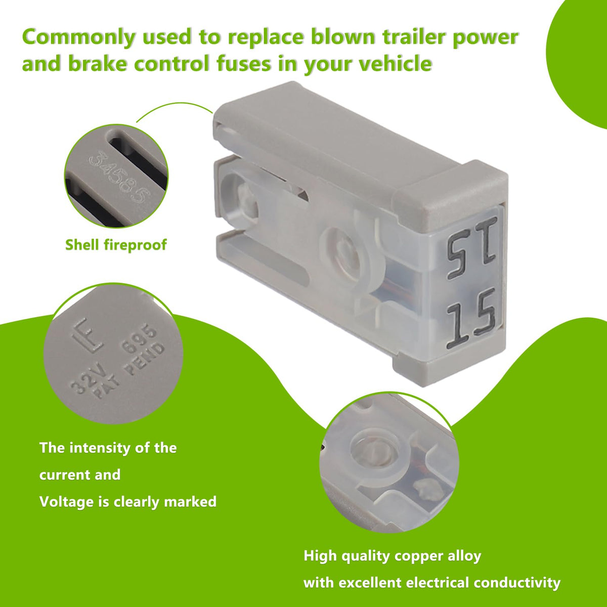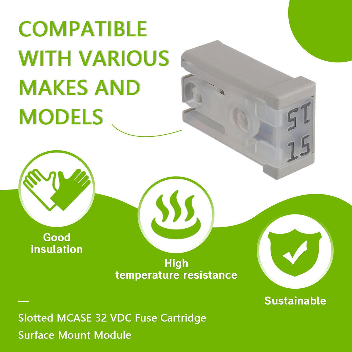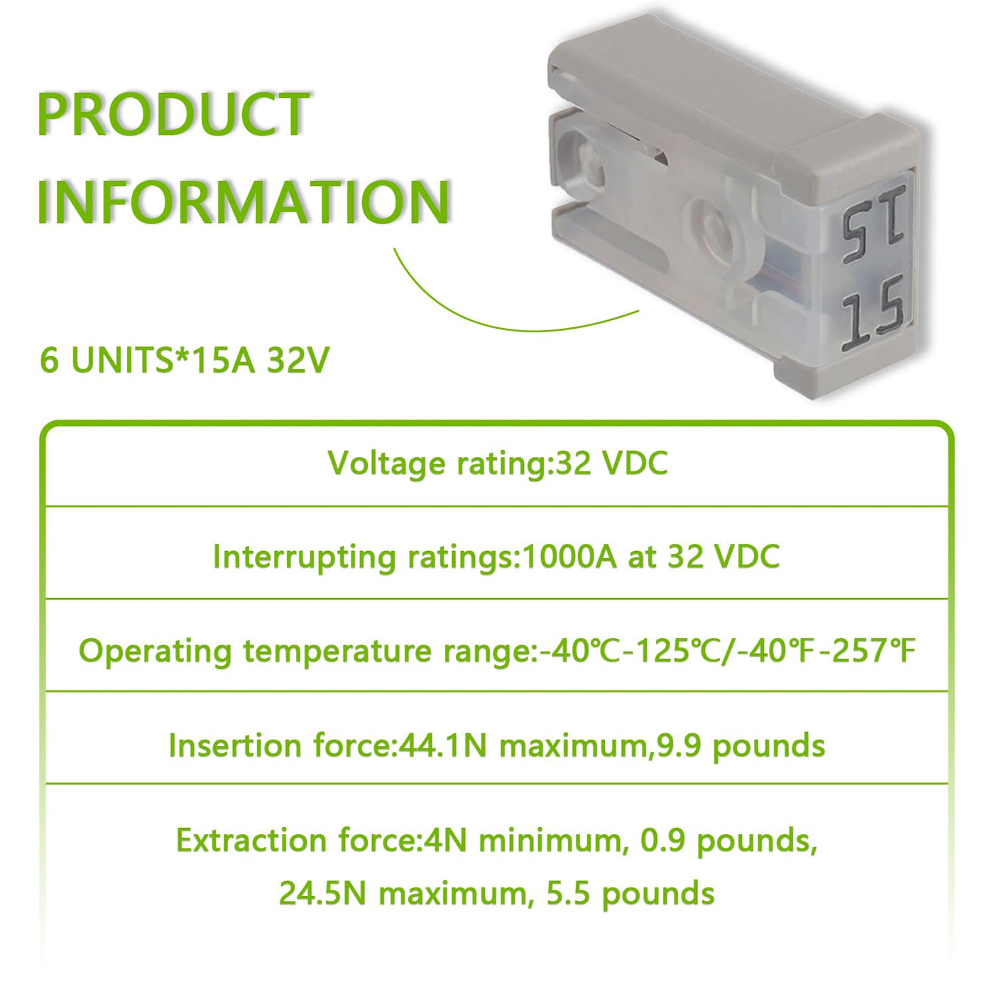 EPLZON 15A Slotted MCASE 32 VDC Fuse Cartridge Surface Mount Module ??Widely used in car truck SUV home boat RV ATV UTV golf cart and more electronic equipment. ??TIPS:Compatible with various makes and models Specifications: ??Voltage rating:32 VDC ??Interrupting ratings:1000A at 32 VDC ??Operating temperature range:-40?-125?/-40?-257? ??Insertion force:44.1N maximum,9.9 pounds ??Extraction force:4N minimum, 0.9 pounds,24.5N maximum, 5.5 pounds Package include: 6pcs * 15A Slotted MCASE Fuse