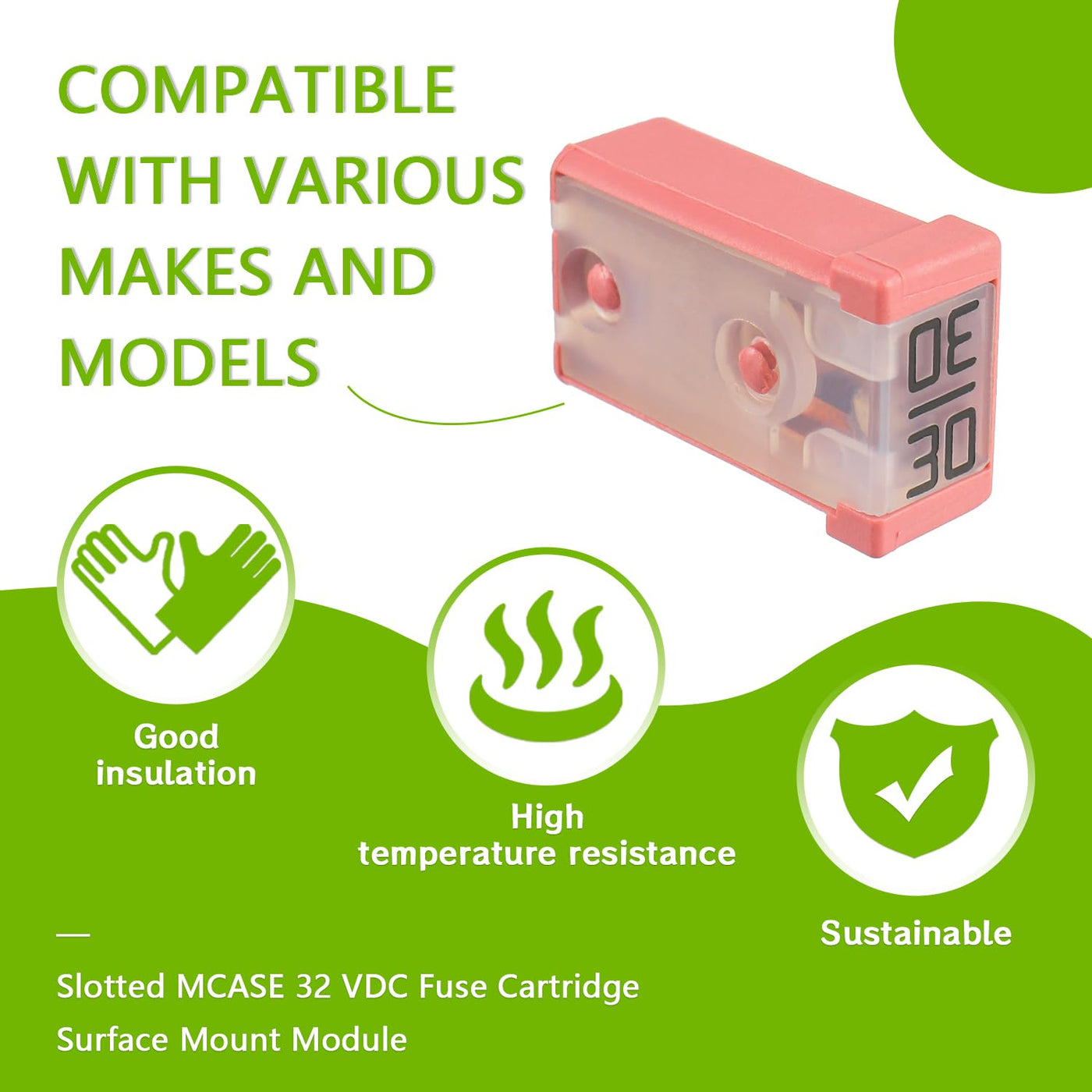 EPLZON 30A MCASE 32 VDC Fuse Cartridge Surface Mount Module ??Widely used in car truck SUV home boat RV ATV UTV golf cart and more electronic equipment. ??TIPS:Compatible with various makes and models Specifications: ??Voltage rating:32 VDC ??Interrupting ratings:1000A at 32 VDC ??Operating temperature range:-40?-125?/-40?-257? ??Insertion force:44.1N maximum,9.9 pounds ??Extraction force:4N minimum, 0.9 pounds,24.5N maximum, 5.5 pounds Package include: 6pcs * 30A MCASE Fuse