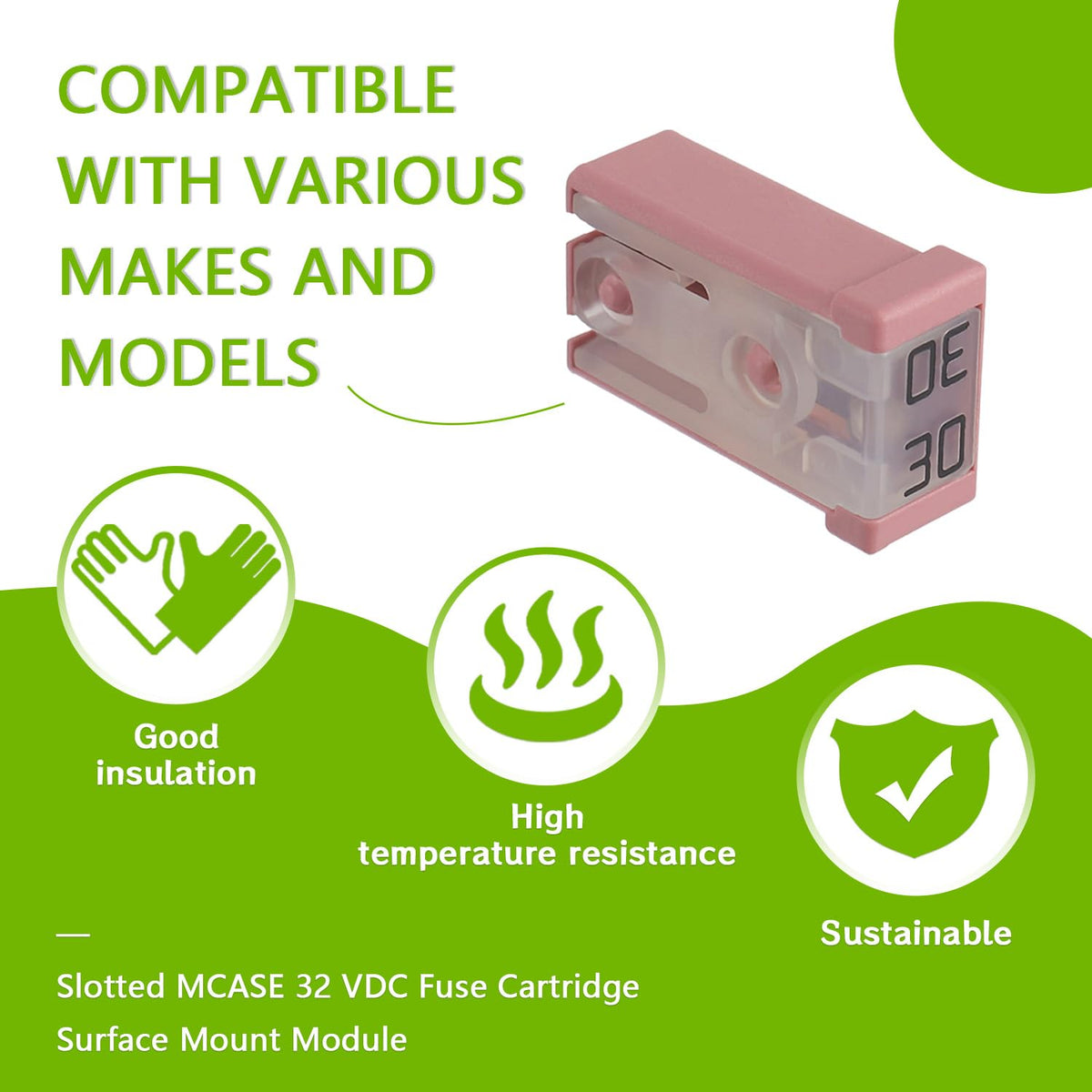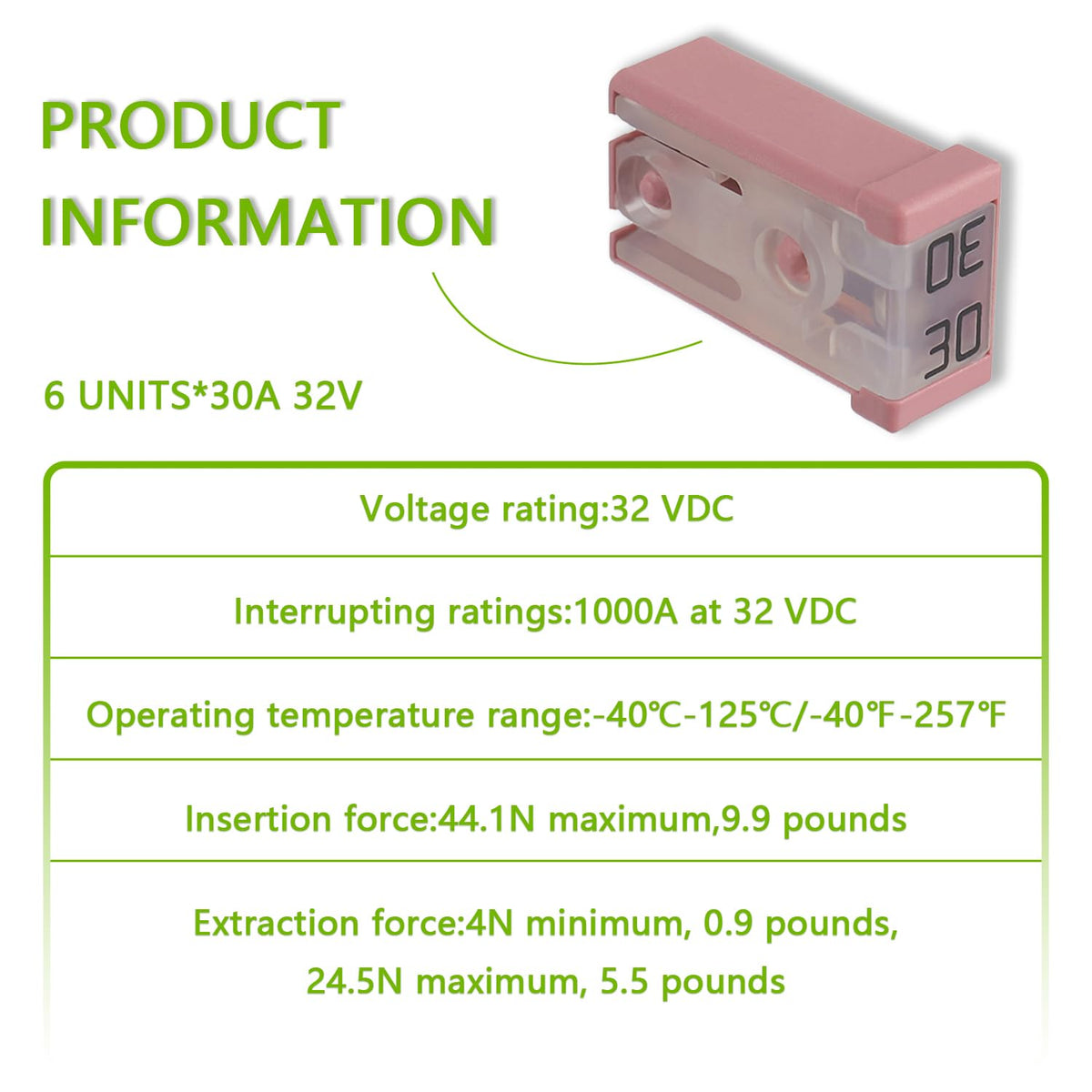 EPLZON 30A Slotted MCASE 32 VDC Fuse Cartridge Surface Mount Module ??Widely used in car truck SUV home boat RV ATV UTV golf cart and more electronic equipment. ??TIPS:Compatible with various makes and models Specifications: ??Voltage rating:32 VDC ??Interrupting ratings:1000A at 32 VDC ??Operating temperature range:-40?-125?/-40?-257? ??Insertion force:44.1N maximum,9.9 pounds ??Extraction force:4N minimum, 0.9 pounds,24.5N maximum, 5.5 pounds Package include: 6pcs * 30A Slotted MCASE Fuse