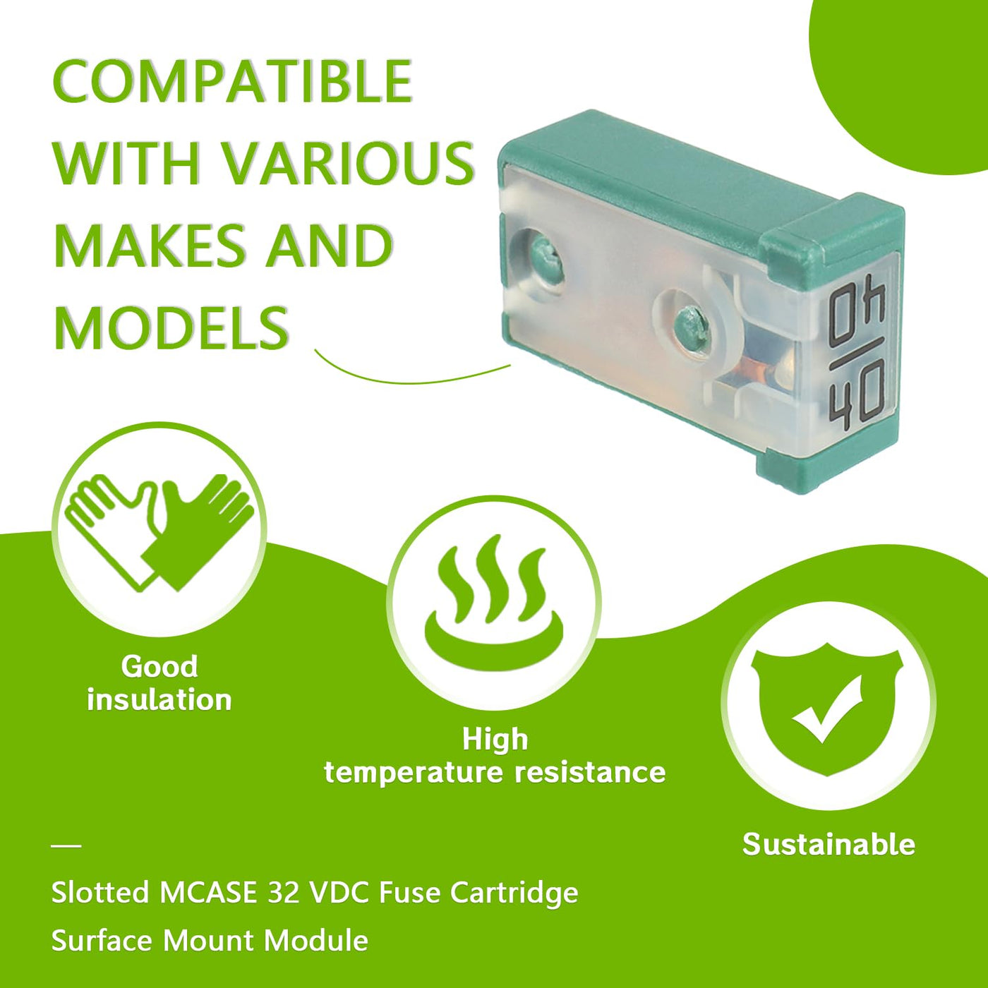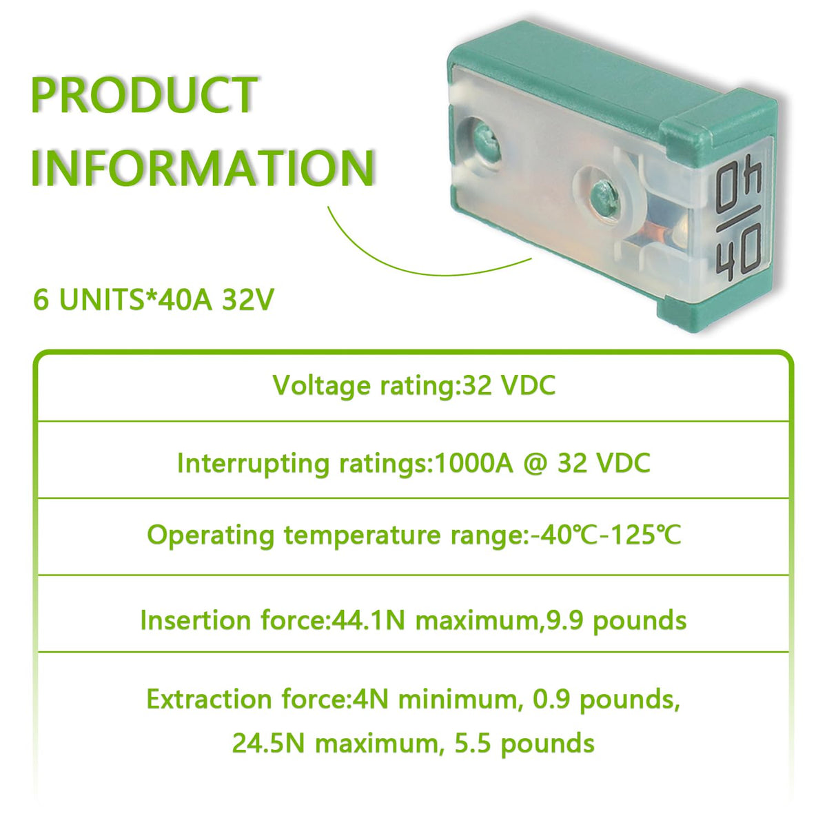 EPLZON 40A MCASE 32 VDC Fuse Cartridge Surface Mount Module ??Widely used in car truck SUV home boat RV ATV UTV golf cart and more electronic equipment. ??TIPS:Compatible with various makes and models Specifications: ??Voltage rating:32 VDC ??Interrupting ratings:1000A at 32 VDC ??Operating temperature range:-40?-125?/-40?-257? ??Insertion force:44.1N maximum,9.9 pounds ??Extraction force:4N minimum, 0.9 pounds,24.5N maximum, 5.5 pounds Package include: 6pcs * 40A MCASE Fuse