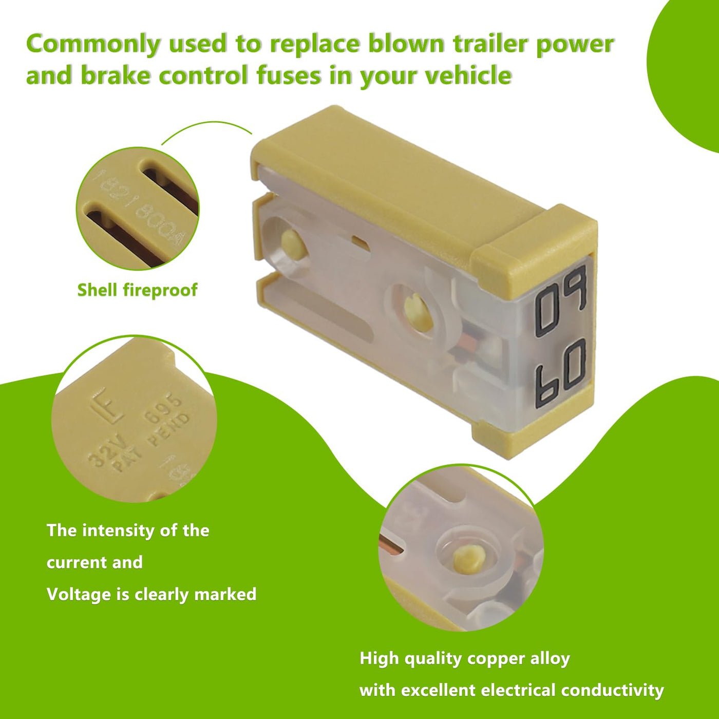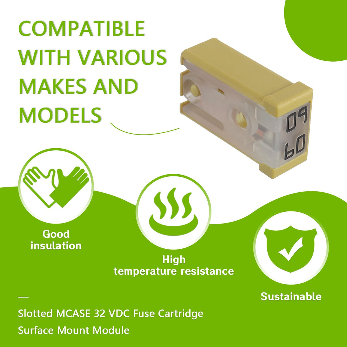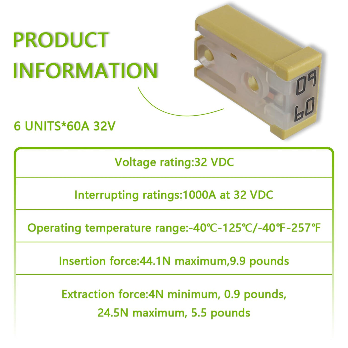 EPLZON 60A Slotted MCASE 32 VDC Fuse Cartridge Surface Mount Module ??Widely used in car truck SUV home boat RV ATV UTV golf cart and more electronic equipment. ??TIPS:Compatible with various makes and models Specifications: ??Voltage rating:32 VDC ??Interrupting ratings:1000A at 32 VDC ??Operating temperature range:-40?-125?/-40?-257? ??Insertion force:44.1N maximum,9.9 pounds ??Extraction force:4N minimum, 0.9 pounds,24.5N maximum, 5.5 pounds Package include: 6pcs * 60A Slotted MCASE Fuse