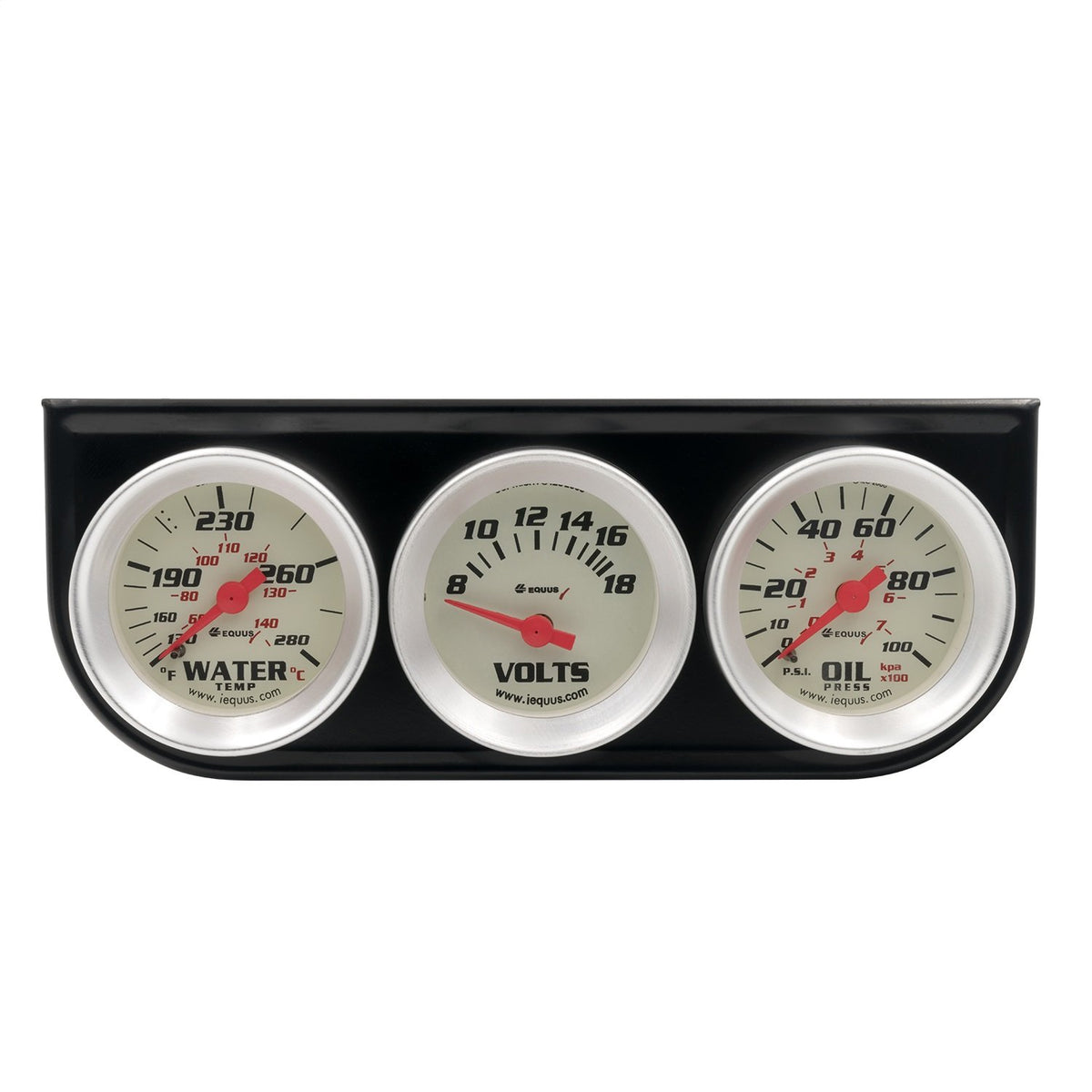 Q: What gauges are included in the Equus 8100 Triple Gauge Kit?A: The Equus 8100 Triple Gauge Kit includes three essential gauges: a water temperature gauge, a voltmeter, and an oil pressure gauge. This comprehensive set allows for accurate monitoring of critical engine parameters.