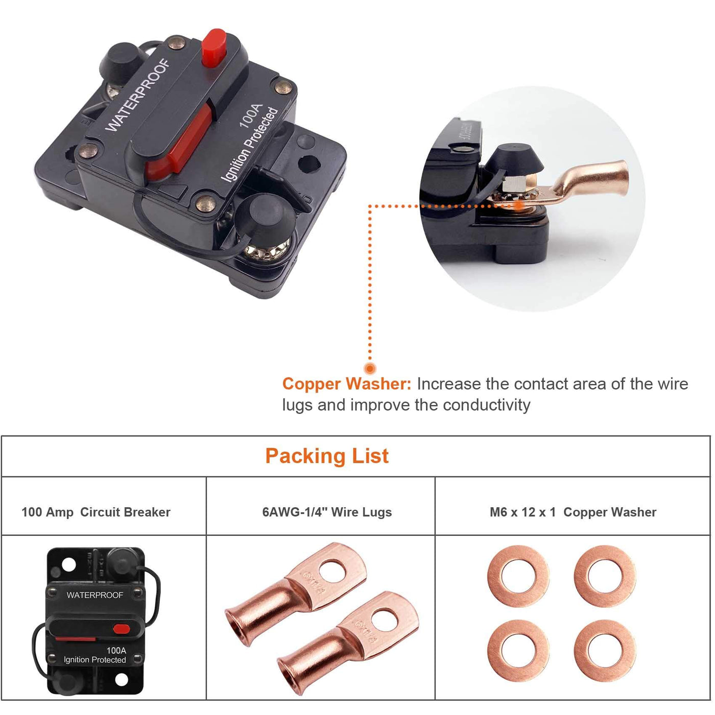 Erayco 12V- 48VDC Waterproof 60 Amp fuse Marine Circuit Breaker with Manual Reset b>Features: -Stops power surges from damaging your amps ,protects your trolling motor from electrical damage. -Mount on panel or firewall unique push button reset can also be used as a kill switch -No more spending money on replacing fuses -Unique push button reset can also be used as a kill switch -Good conductivity and craftsmanship, high temperature pressure -Application: Typically used in auxiliary and accessory circuits for Boat, Trucks, Buses, Marine, RV and ATV applications. Also can used as an on/off button switch for the battery or DC sound system. b>Specifications: -Rated current: 60 Amp -Rated voltage: 12-48VDC Maximum -Breaking capacity: 3000A @ 48 VDC -Manual Reset Circuit Breaker -Red manual reset button -Surface Mount, protective stud insulator included -Ambient temperature: -32 C to 82 C (-25 F to 180 F) -Storage Temperature: -34 C to 149 C (-30F to 300F ) Size: (LxWxH) 74 x 49 x 44 mm /2.9 x 1.9 x1.7 inch b>Package Includes: 1 x 60 amp Marine Circuit Breaker 2 x 6AWG-1/4'' Wire Lugs 4 x M6 Copper Washers b>Notes: 1.Due to the different monitor and light effect, the actual color of the item might be slightly different from the color showed on the pictures. 2.Please allow 1-3cm measuring deviation due to manual measurement.