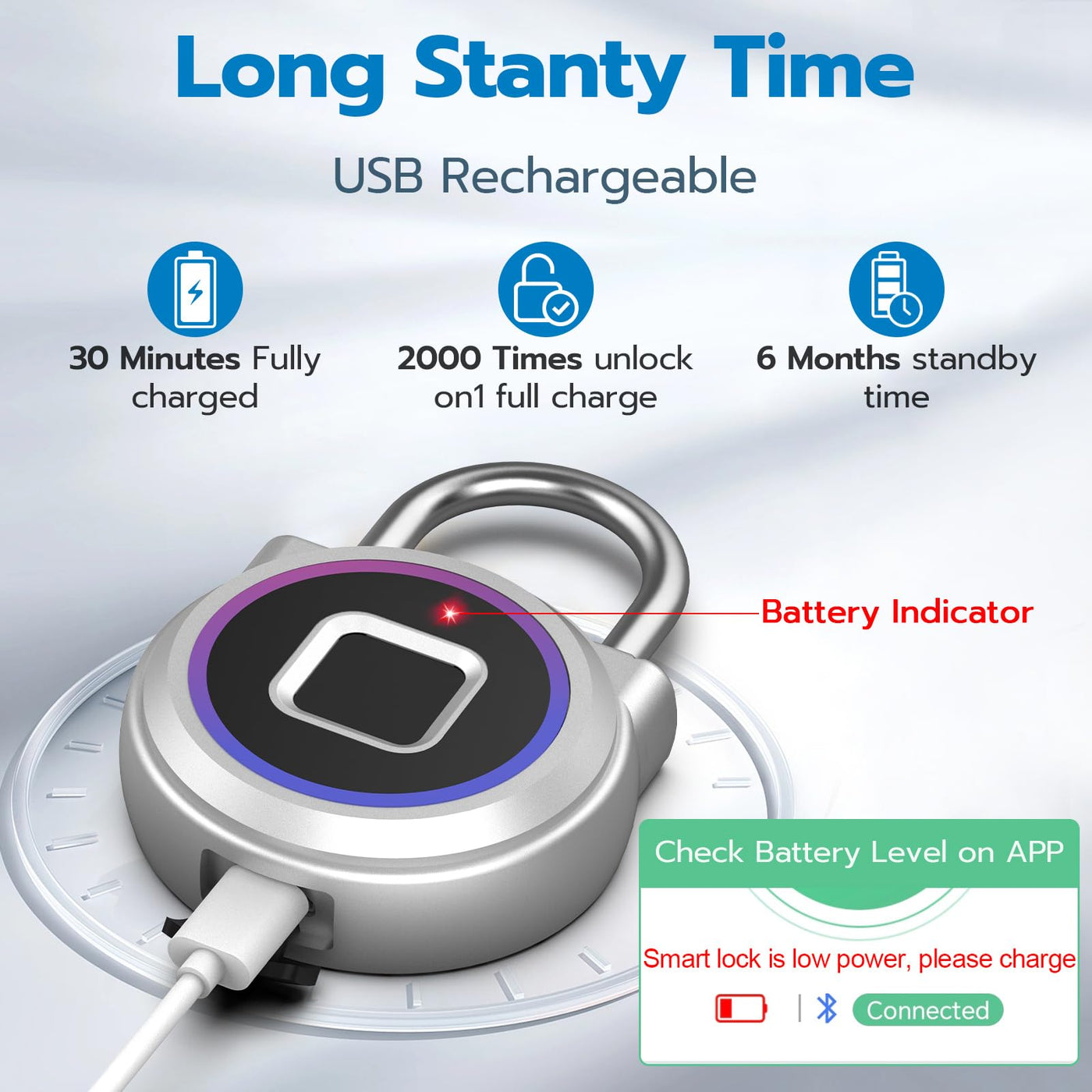 Q: How long does the battery last on the fingerprint lock?A: The padlock features a 110MAH rechargeable lithium battery that provides over six months of standby time and can handle more than 2000 unlocks before needing a recharge.
