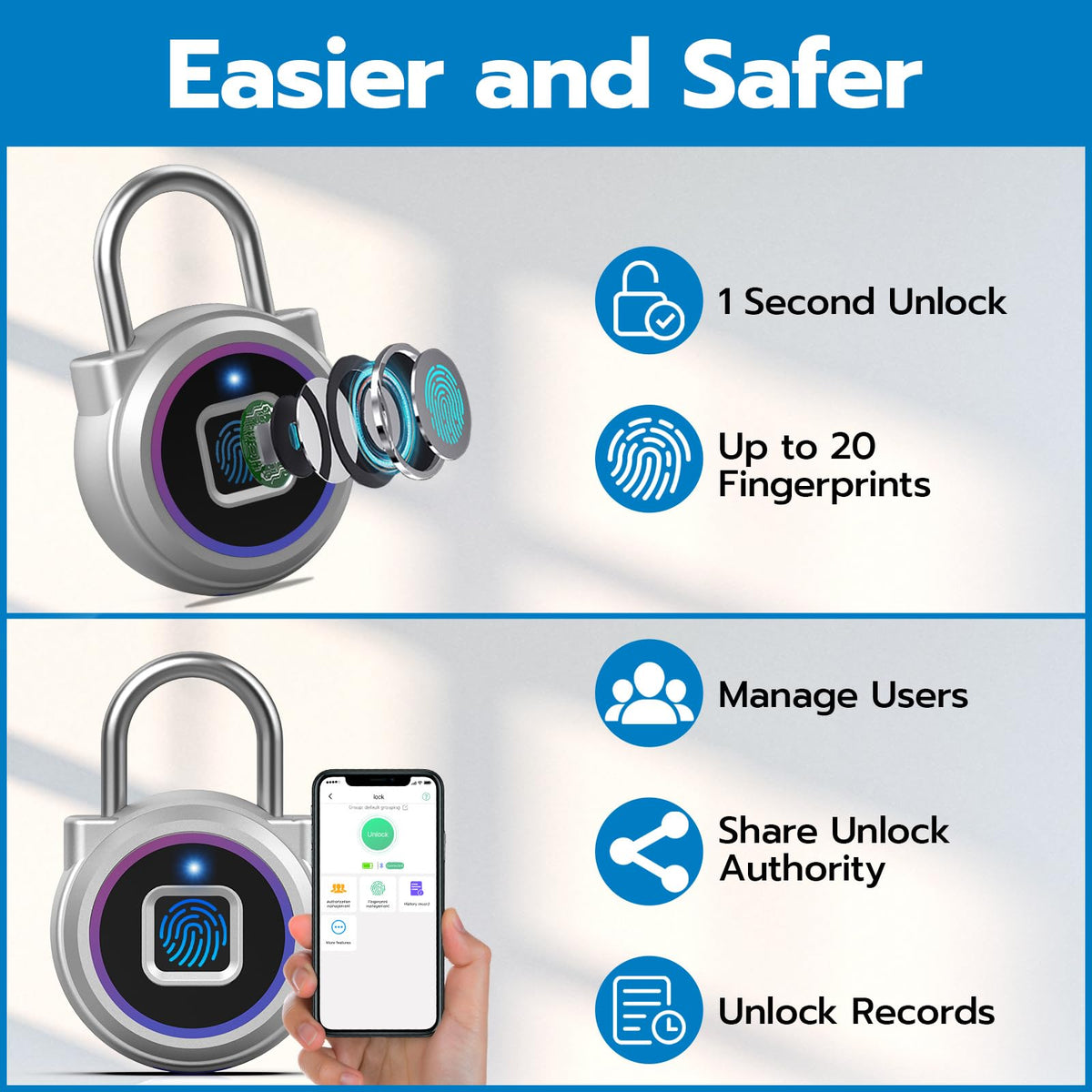 Q: How does the Eseesmart Fingerprint Padlock work?A: The Eseesmart Fingerprint Padlock uses advanced biometric technology to unlock with just a tap of your finger, taking only 0.2 seconds. It can store up to 15 distinct fingerprints, allowing multiple users to access the lock securely.