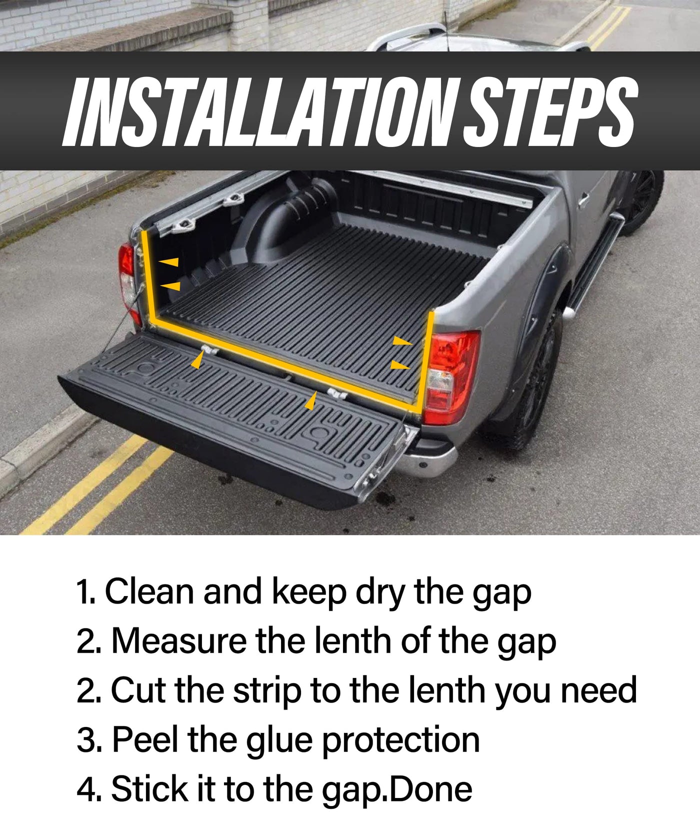 Q: How do I install the adhesive tailgate seal?A: To install the ESEWALAS tailgate seal, clean the gaps of your truck and ensure they are dry. Measure the length of the tailgate gap and cut the tape to the required length. Then, remove the red film and press it into the gap. For optimal adhesion, avoid exposing it to water for 3 days after installation.