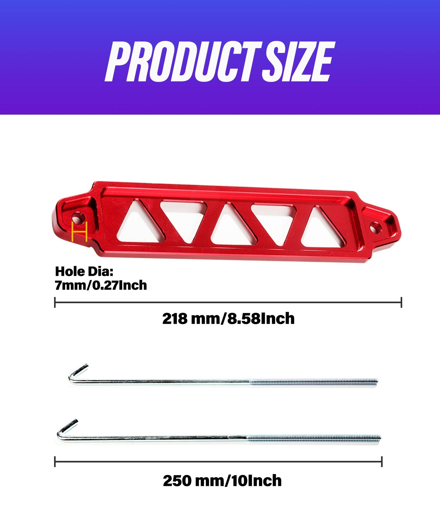 Q: What materials is the ESEWALAS Aluminum Alloy Battery Hold Down Bracket made from?A: The ESEWALAS Battery Hold Down Bracket is constructed from high-quality aluminum alloy, ensuring it is sturdy, rust-proof, and resistant to oxidation. The included bolts are made of durable stainless steel for long-lasting performance.