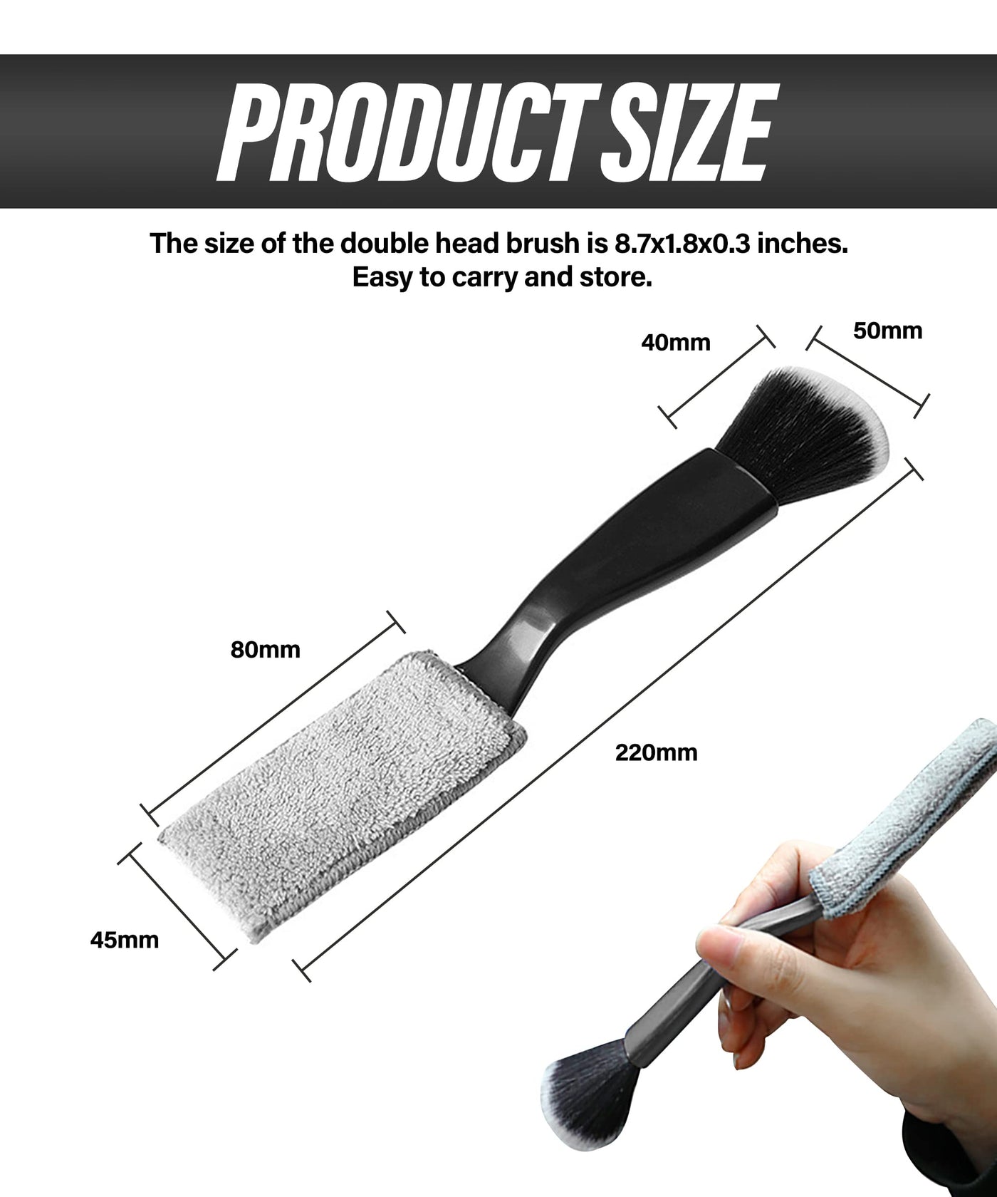 Q: Can this detailing brush be used on other surfaces besides cars?A: Yes, the dual head design of this detailing brush makes it versatile for cleaning various surfaces such as air conditioning vents, computer keyboards, leather seats, and windows, making it a great tool for both automotive and household cleaning.