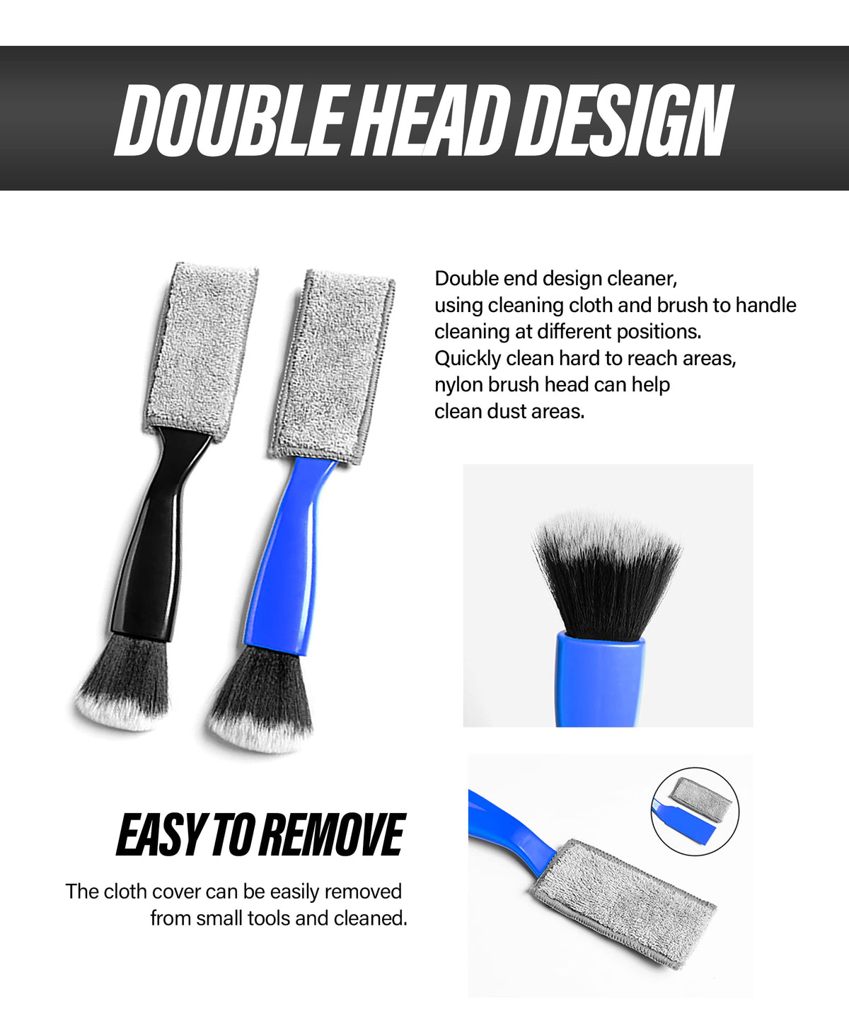 Q: What advantages does the 2 in 1 design offer for car cleaning?A: The 2 in 1 design of the Reswish Duster combines a cleaning cloth and a brush, allowing users to quickly switch between wiping and brushing. This feature efficiently tackles various messes, making it easier to clean different surfaces without needing multiple tools.