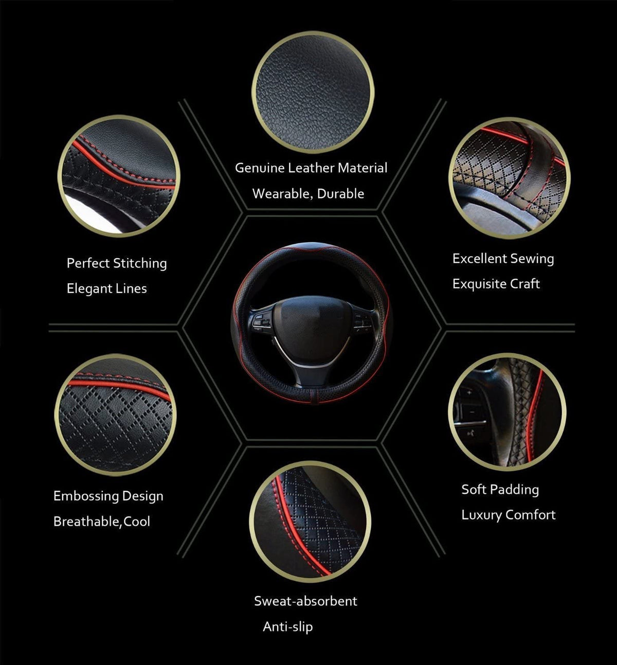 Q: How does this cover protect my steering wheel?A: The leather car steering wheel cover protects against fading, cracking, and peeling due to sun exposure and extreme weather, as well as dirt, dust, and fingerprints.