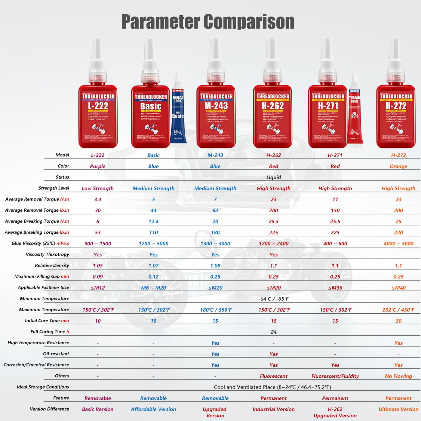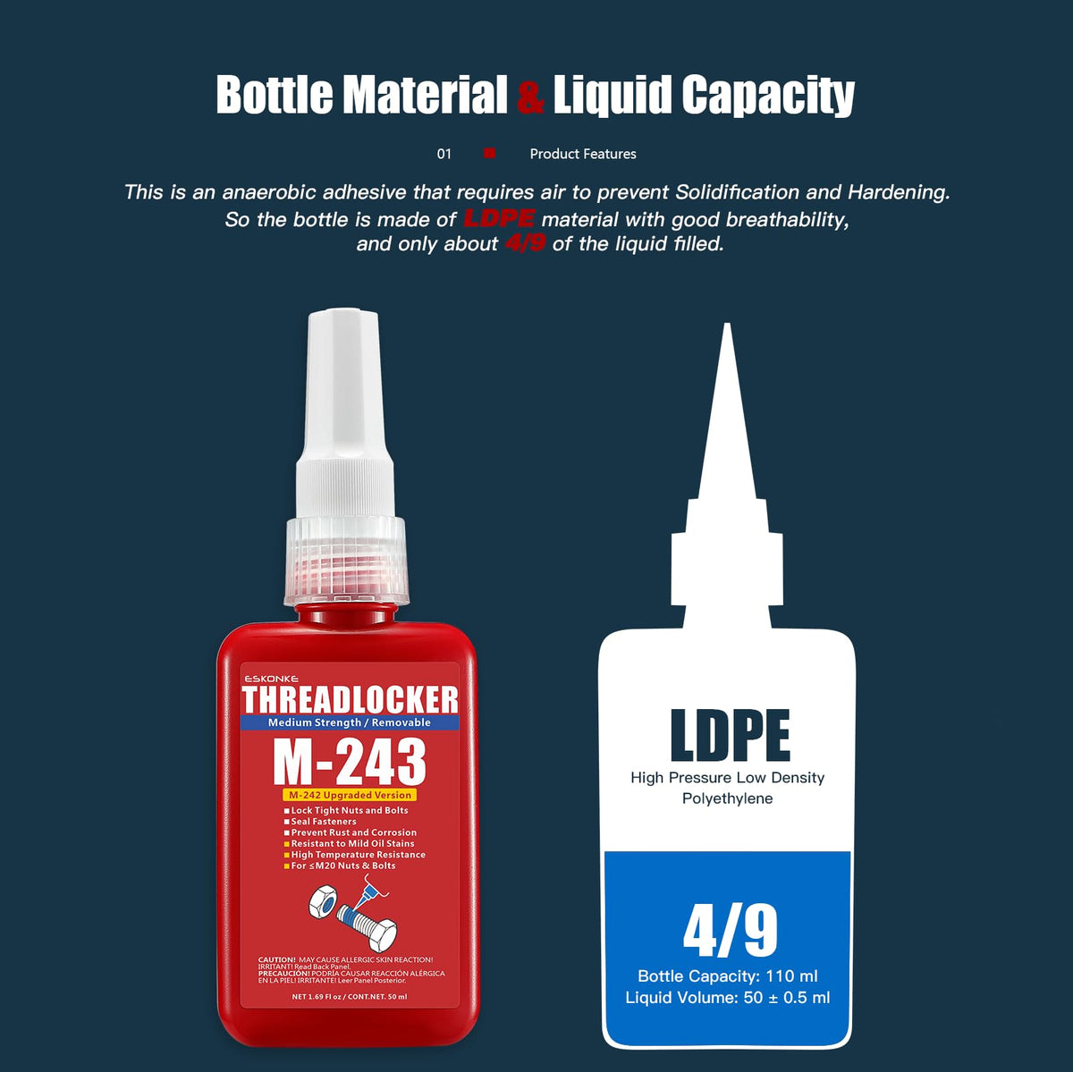Product Advantages: Enhanced Efficiency: Simple operation, Room temperature curing, and Fast curing. Particularly suitable for frequent disassembly and installation. Vibration/Shock Resistance: Locking bolts & nuts, effectively resisting the impact of vibration and shock to ensure equipment stability. Penetration & Sealing: Enhances thread rust, stain and corrosion resistance. Simplify the Process: No need tools. Simply apply the glue to the desired part for bonding. High Strength after Curing with Minimal Shrinkage. Uncured Overflow Glue can be easily Removed. Excellent Durability: Excellent performance in pressure /vibration /impact /chemical resistance, extreme temperature, corrosion and moisture resistance. Solvent-free Product: EP & pollution-free during use. Easy to transport/store safely. Cost Savings: there is no need to purchase spare gaskets of different sizes and traditional fasteners of different calibers to meet the locking requirements of different equipment Note: Please shake before use to ensure uniform composition; And ensure that the fastener lock position is clean, dry and oil-free; This product needs to be in full contact with the air to prevent curing. So it only have 4/9 of the liquid in the bottle; It is not suitable for =M32 bolts. Oversize bolts will affect the curing speed and strength due to excessive thread clearance; It is suitable for common metal screw materials in the market, such as carbon steel/ stainless steel/ alloy steel/ copper/ aluminum alloy/ titanium alloy, etc; It is not suitable for stone /plastic /rubber /wood /paper /glass /ceramic /cement /fiber and other non-metallic materials bonding and fixing; It is not suitable for use in pure oxygen, pure chlorine or oxygen-rich, chlorine-rich environment, nor can it be used as a sealing material of hydroxide material; Do not pour back the unused glue, so as not to pollute the original glue; No smoke is produced during curing. Please seal immediately after use to avoid volatilization of active ingredients; Please store it in room temperature, cool place, avoid sunlight and high temperature environment;