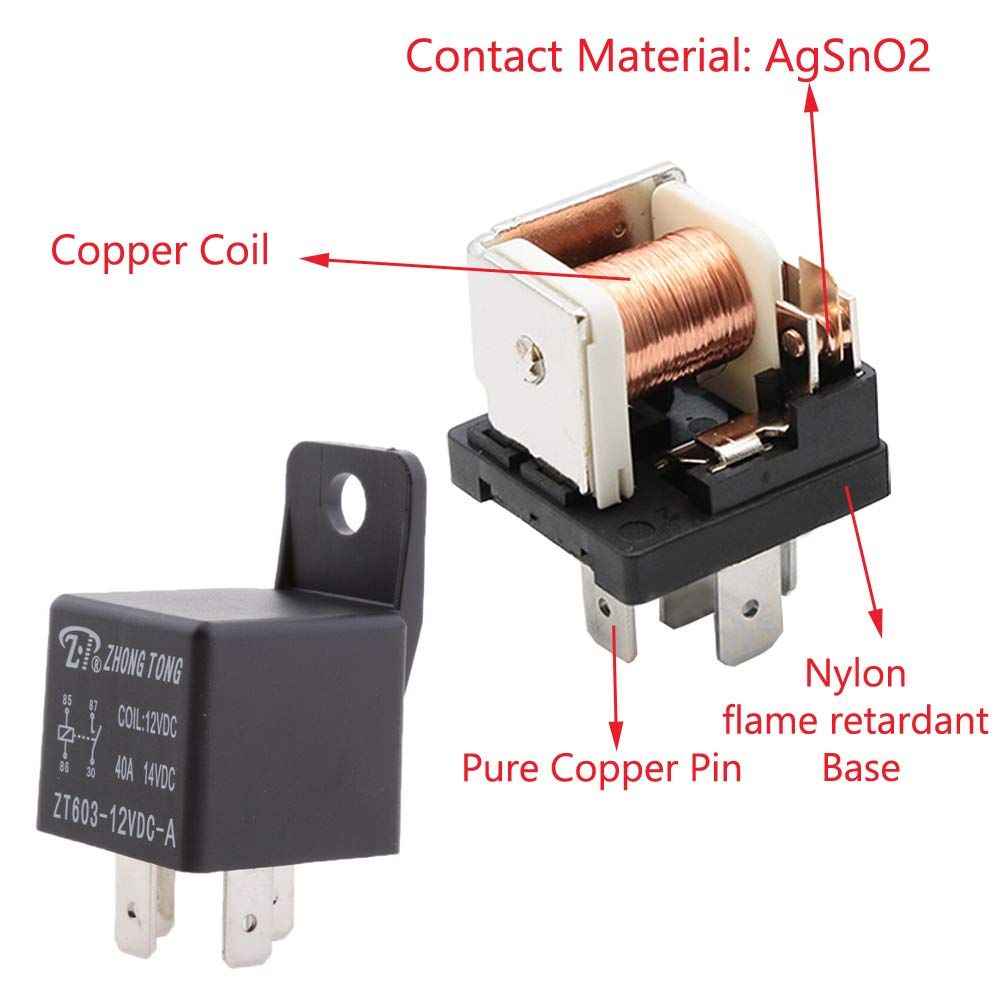1.Brand New Heavy Duty Spst Relays 2.12 Volt 40 Amp 4-Prong Relays 3.Mechanical Life Of 10,000+ Cycles 4.High 40A Coil Capacity- Able To Handle Those High Current Applications With Ease 5.Hundreds Of Uses Include- Starter Kills, Domelight Supervision, Trunk Release, Polarity Change,Power Door Lock/Actuator Control, Change A Low Current Output To High Current,Add Ignition/Accessory Outputs, Control Motors/Other Electronics, It Is Also Suitable For Automobile Used For Control, Alarms, Horn, Headlight And More.... Package Include 5 X 40A Replay (4Pin) 5 X Relay Socket Wire