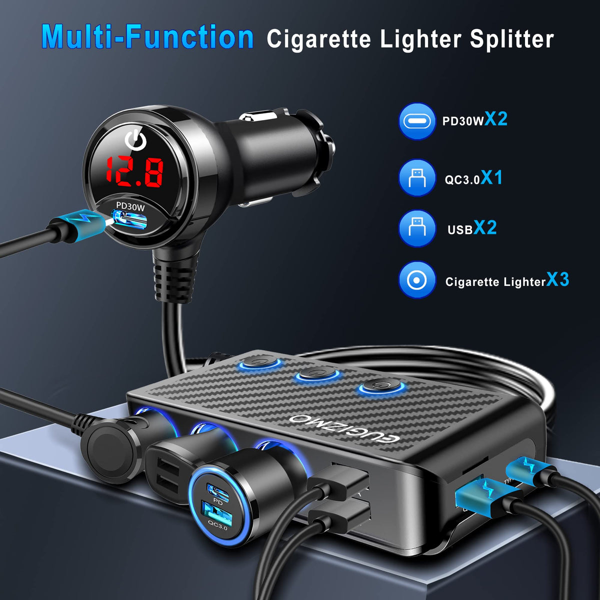 EUGIZMO Car Cigarette Lighter Plug Splitter Adapter 3 Socket Car Charger with Plug Outlet & LED Voltage Display & Independent Switches ?Key Features? ?8 in 1 Cigarette Lighter Splitter? Equipped with 5 charging ports and 3 car cigarette lighter sockets, provides 222W power in total; ?QC3.0 Super Fast Charging? The cigarette lighter adapter built-in smart IC chip, with 2pcs PD 30W & 1pc QC3.0 (18W) charging ports to maximize your device charging speed, providing 5X faster than normal car phone chargers; ?With LED Voltage Display? This car cigarette lighter with the real-time LED voltage display to monitor the output of the car battery, keeping abreast of car battery health in real time; ?With Independent Power Switches? The 12 volt splitter cigarette lighter extension cord is equipped with 3 independent On/Off switches for each cigarette socket, makes charging more convenient; ?Wide Compatibility & Application? This cigarette lighter usb charger is widely used in 12-24V vehicles, like SUV, Truck, MPV, RV, off-road and other vehicles. And applied to a variety of automobile gadgets, including Refrigerators, Humidifiers, Pumps, Seat Heater/ Coolers, GPS, Dash Cam and Sat Navs, etc. Besides, it's compatible with most of USB power devices, including Laptops, Kindles, iPads, MacBook, Air Pods, Samsung, iPhones, Motorola, TCL, LG, Sony, Android phones, etc; ?Package Includes? 1 x EUGIZMO Car Charger with Plug Outlet 2 x Sticky Sticker 1 x User Manual