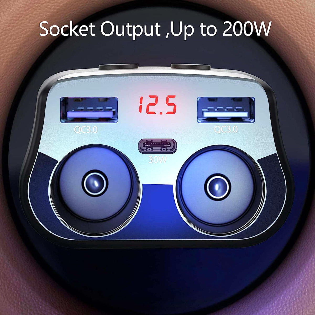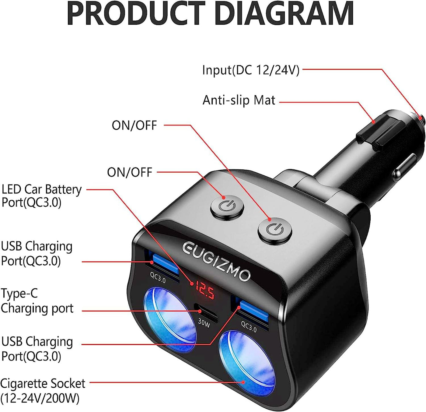 Eugizmo 5 In 1 200W&Nbsp;Car Charger Adapter Double Cigarette Lighter Adapter Outlet With Led Voltage Display &Amp; Independent Power Switches