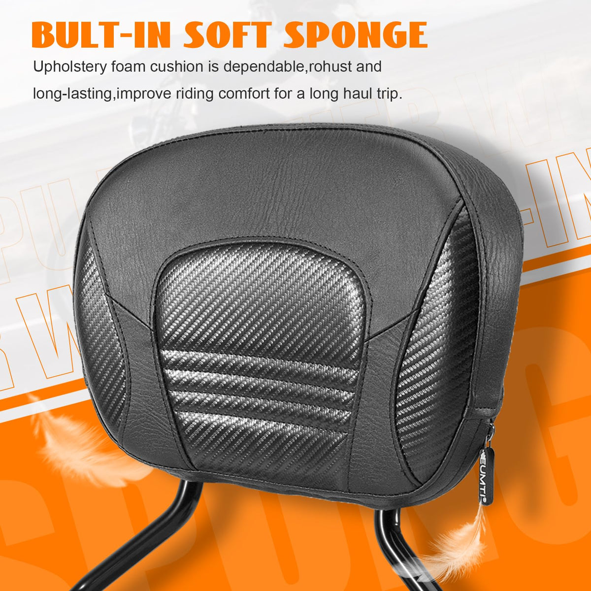Q: What features enhance passenger comfort on this sissy bar?A: The large backrest pad is filled with high-density memory foam, providing excellent support and comfort for passengers. The design also includes sweeping curves for a better leaning position.