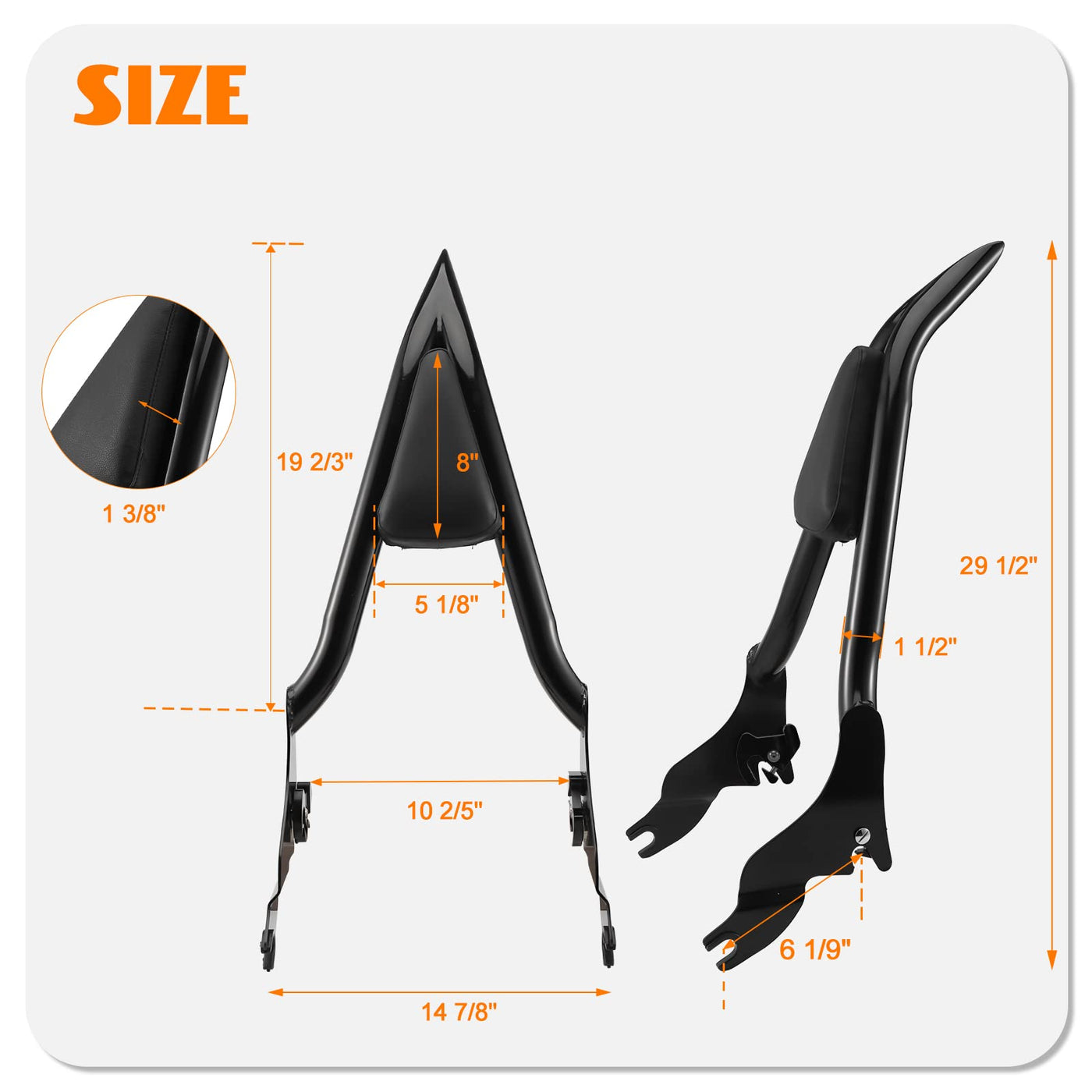 Q: What materials are used in the construction of the Eumti Sissy Bar?A: The Eumti Sissy Bar is constructed from high-quality metal, ensuring durability and resistance to rust. The back cushion is made from PU leather combined with memory foam for maximum comfort and water resistance.