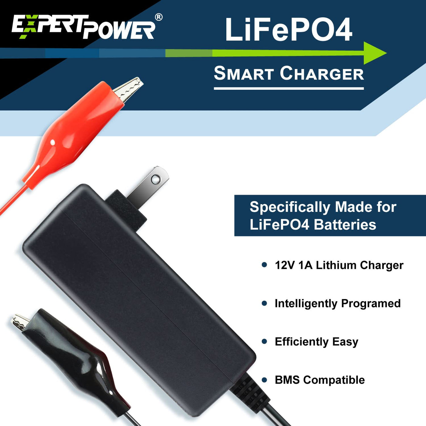 Expertpower 12V 1A Smart Charger For Lithium Lifepo4 Deep Cycle Rechargeable Batteries | Dc 5521 Male & Alligator Clips | Kids R