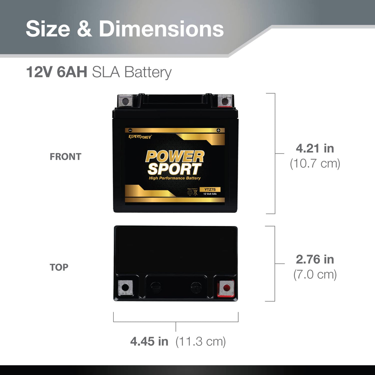 Q: What are the dimensions and weight of the ExpertPower ETZ7S YTZ7S battery?A: The ExpertPower ETZ7S YTZ7S battery has dimensions of 4.45 inches in length, 2.76 inches in width, and 4.21 inches in height. It weighs approximately 4.6 lbs.