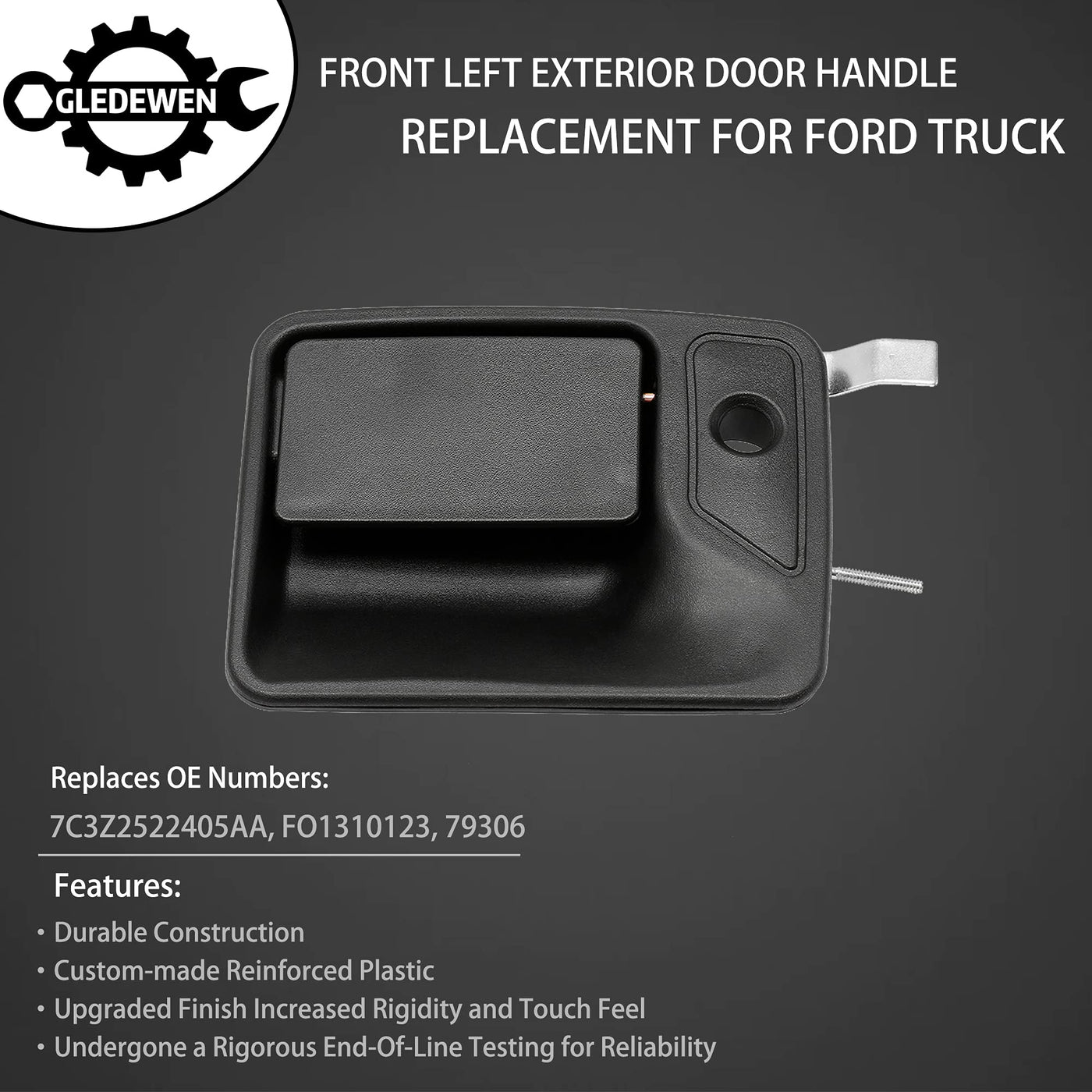 Q: Is the Gledewen Exterior Door Handle compatible with my Ford vehicle?A: Yes, the Gledewen Exterior Door Handle is compatible with several Ford models including the 1999-2016 Ford F-250, F-350, F-450, F-550 Super Duty, and the 2000-2005 Ford Excursion, among others. Please check the specific model years to ensure compatibility.