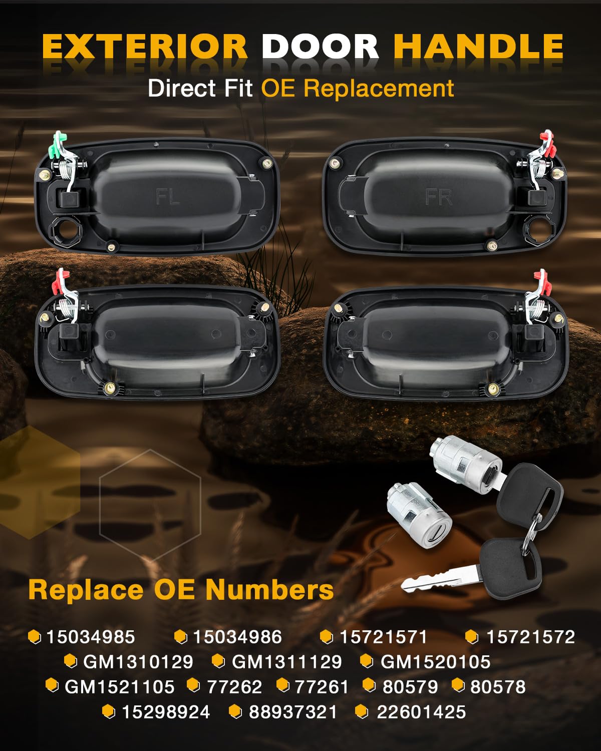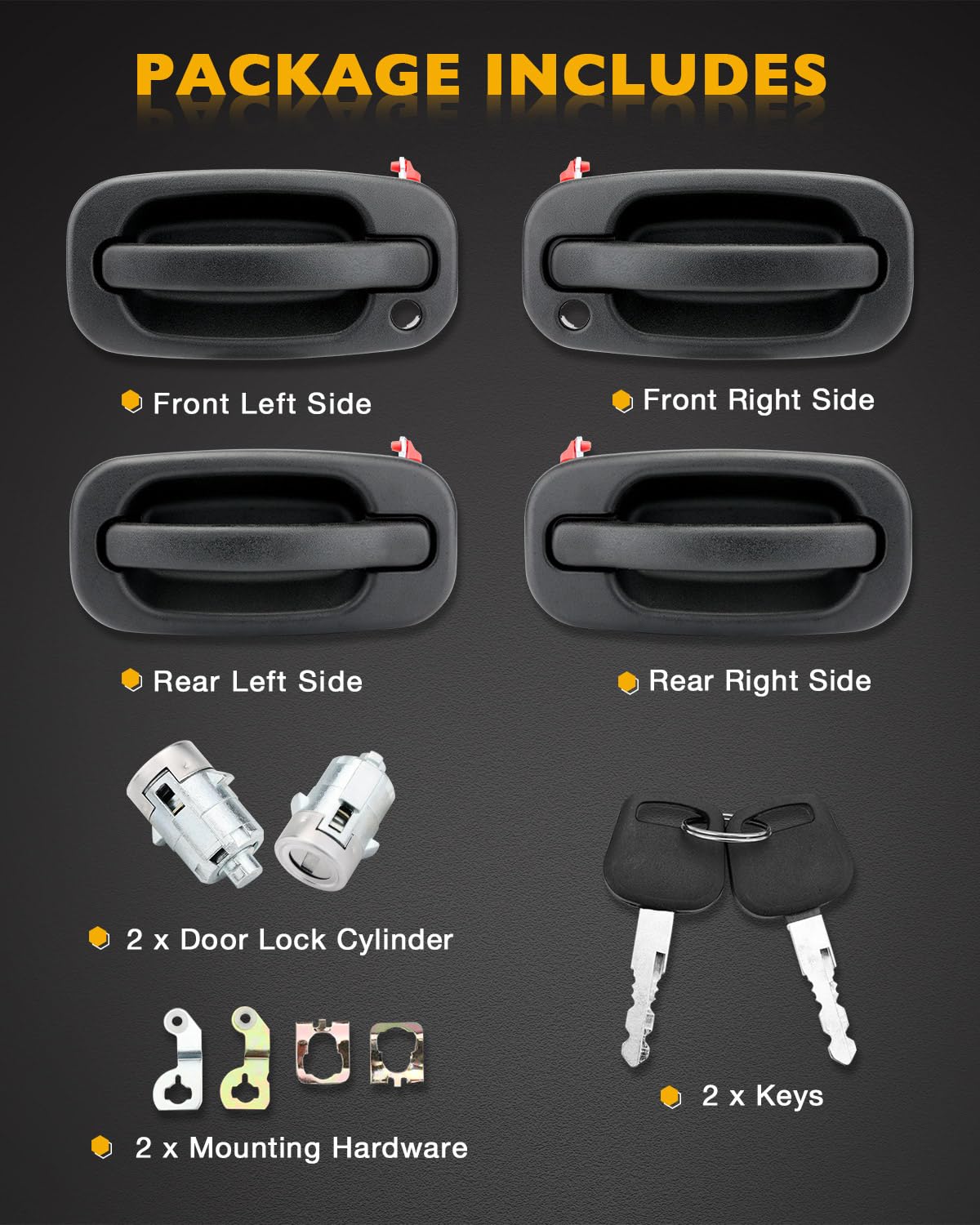 Exterior Door Handle Set (4Pcs), W/Lock Cylinders & Keys, For 1999-2007 Chevy Silverado Suburban Tahoe Avalanche Gmc Sierra Yuko