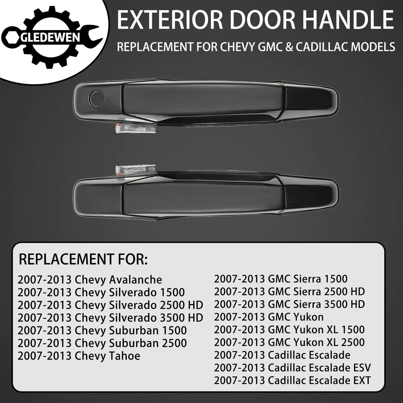 Packing List: 1x Exterior Front Rear Black Door Handle Set Condition: New Compatible with: 2007-2013 Chevy Avalanche 2007-2013 Chevy Silverado 1500 2007-2013 Chevy Silverado 2500 HD 2007-2013 Chevy Silverado 3500 HD 2007-2013 Chevy Suburban 1500 2007-2013 Chevy Suburban 2500 2007-2013 Chevy Tahoe 2007-2013 GMC Sierra 1500 2007-2013 GMC Sierra 2500 HD 2007-2013 GMC Sierra 3500 HD 2007-2013 GMC Yukon 2007-2013 GMC Yukon XL 1500 2007-2013 GMC Yukon XL 2500 2007-2013 Cadillac Escalade 2007-2013 Cadillac Escalade ESV 2007-2013 Cadillac Escalade EXT Precise Fit Part Numbers: 20828258, 22738721, 25960525, 80546,15915150, 22738722, 25960526, 84053436, 80545 Broken door handle? Can 't get in your car? Are you searching for the highest quality, best replacement value door handle? We deserve it. Our outside & inside Door Handle, to replace your old or broken part, will meet or exceed OEM standards.