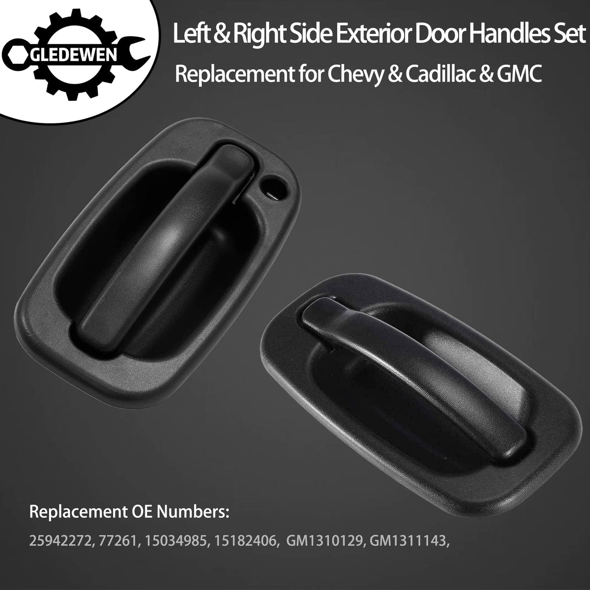 Q: What vehicles are compatible with the exterior door handles set?A: The exterior door handles set is compatible with various models including the 1999-2007 Chevy Silverado, Suburban, Tahoe, Avalanche, GMC Sierra, Yukon, and Cadillac Escalade. Specifically, it fits 1999-2006 Chevrolet Silverado 1500, 2000-2006 Chevrolet Tahoe, and 2002-2006 Cadillac Escalade among others.