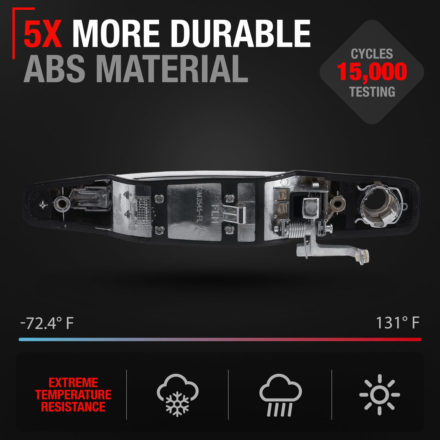 Q: What materials is the exterior door handle made from?A: The exterior door handle is made from high-quality plastic, designed for durability and longevity. It features an all-chrome finish that maintains its sleek appearance over time.