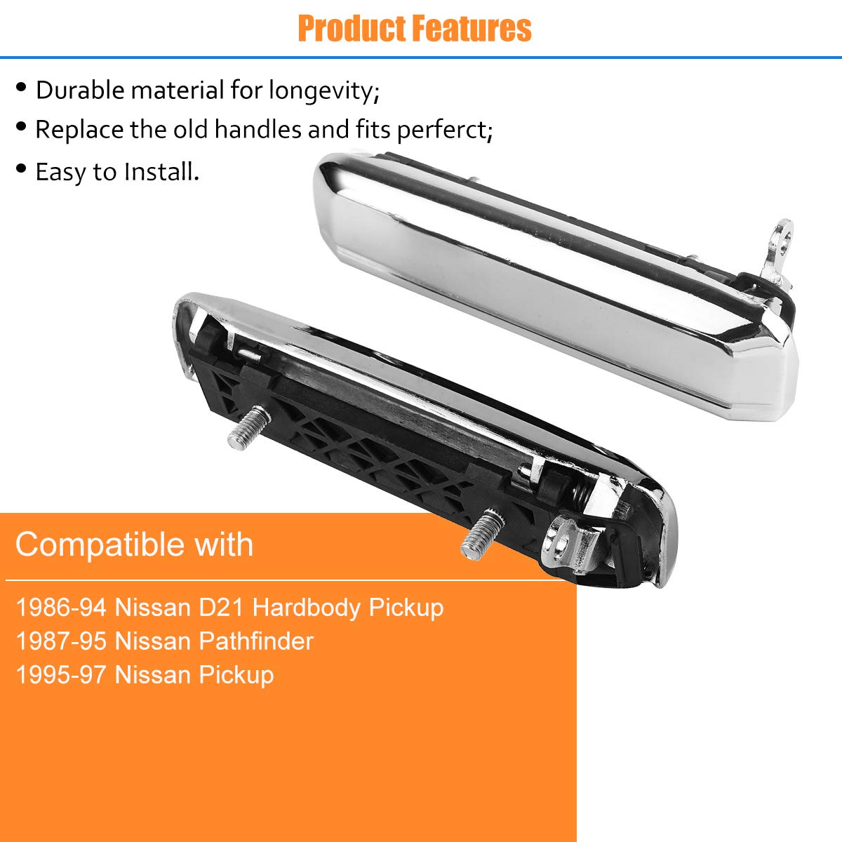 Description: Qty: Comes As A Pair Location: Fits Exterior Driver Side Passenger Side Front Or Rear Door Handles Finish: Metal, Chrome Finish Replaces Dealer Part Numbers: 90008, 90009, 1150600, 8060701A00, Ni1310101 Built To Strict Quality Control Standards Compatible With: 86 87 88 89 90 91 92 93 94 Nissan D21 Hardbody Pickup Exterior Door Handle 1987-95 Nissan Pathfinder Exterior Door Handle 1995-97 Nissan Pickup Exterior Door Handle
