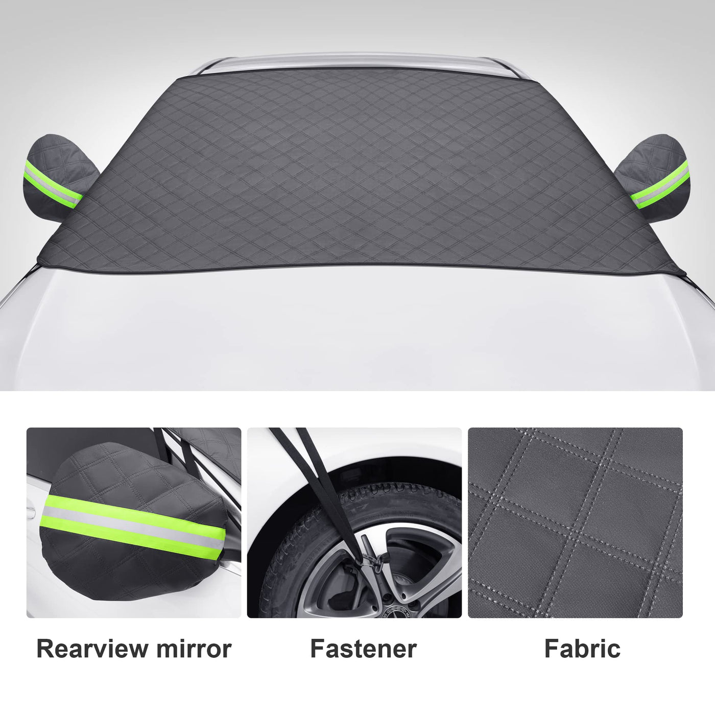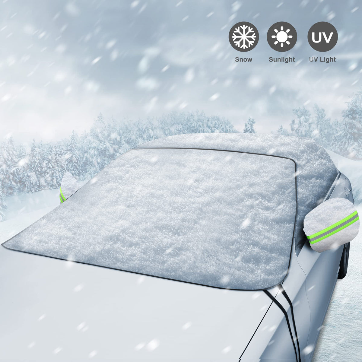 Q: How does the windshield snow cover protect against winter weather?A: This windshield cover provides excellent protection against snow, frost, sleet, slush, hail, and other harsh winter conditions. Its four-layer strengthened material ensures durability and effectiveness in keeping your windshield clear and free from ice buildup.
