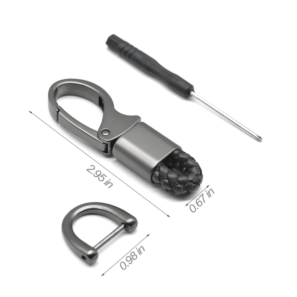 Performance: The rope is genuine leather weave, handy and with good texture. The metal part is made of zinc alloy polished, smooth surface, scratch-proof, rust-proof, durable Fix the key fob on the pants to prevent the keys from being lost. Exquisite workmanship, sturdy and elegant. A braided leather and metal keychain and detachable with 1pcs D ring. You can DIY, easily attach it to any other keys and better organize the keys. Package Included: 1 x Key Chain, Black Color 1 x Screwdriver
